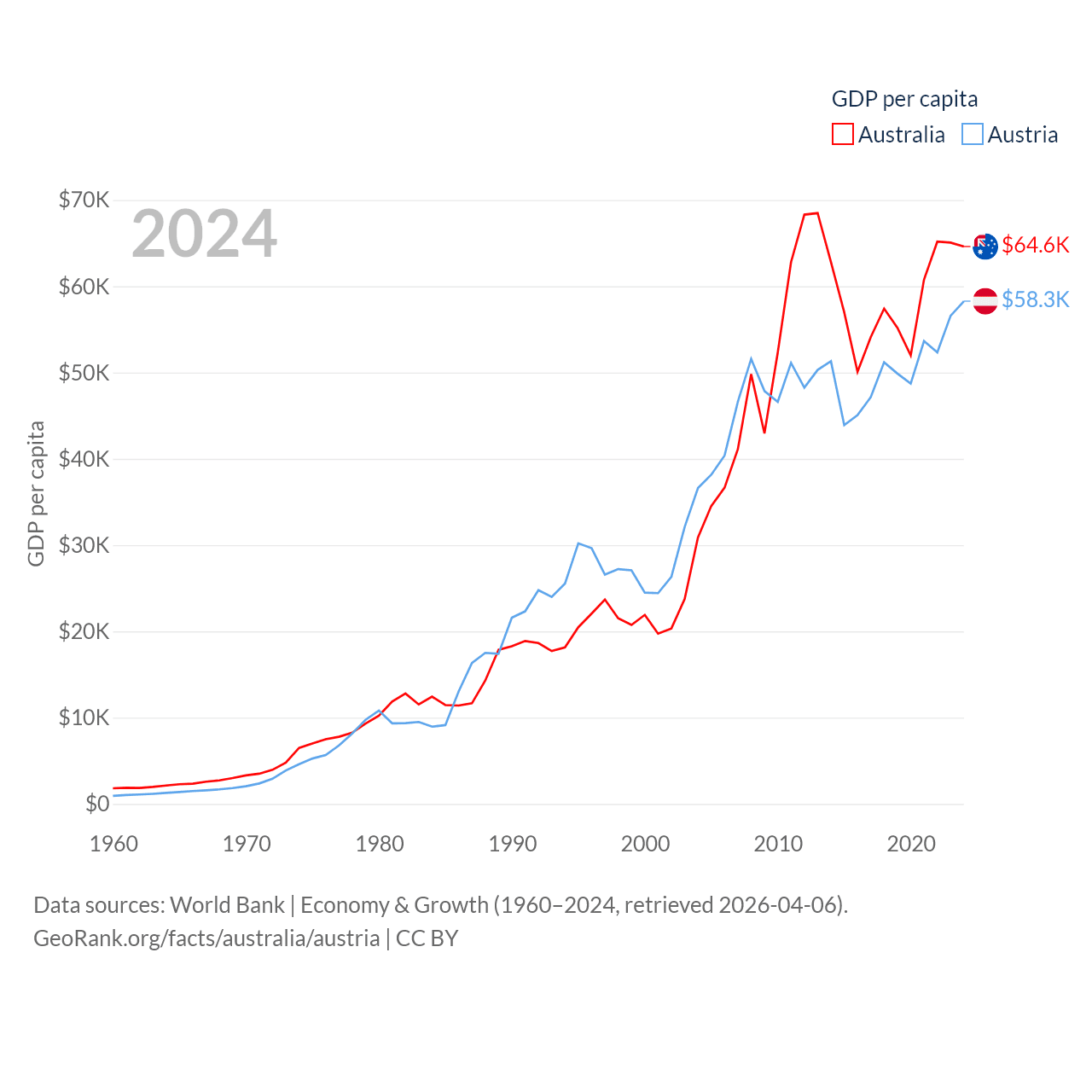 By GDP, Australia ranks 14/197 ($1.76T) and Austria ranks 30/197 ($535B). By GDP per capita, Australia ranks 14/197 ($64,604), while Austria ranks 16/197 ($58,269).