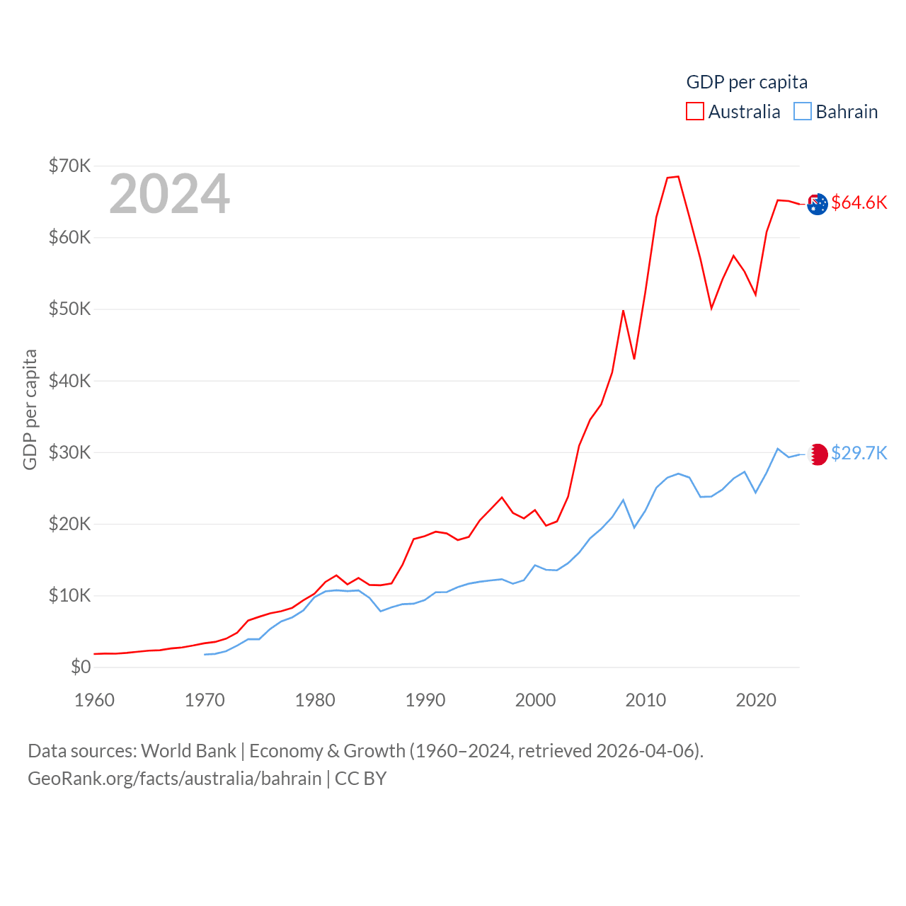 By GDP, Australia ranks 14/197 ($1.76T) and Bahrain ranks 96/197 ($47.1B). By GDP per capita, Australia ranks 14/197 ($64,604), while Bahrain ranks 42/197 ($29,654).