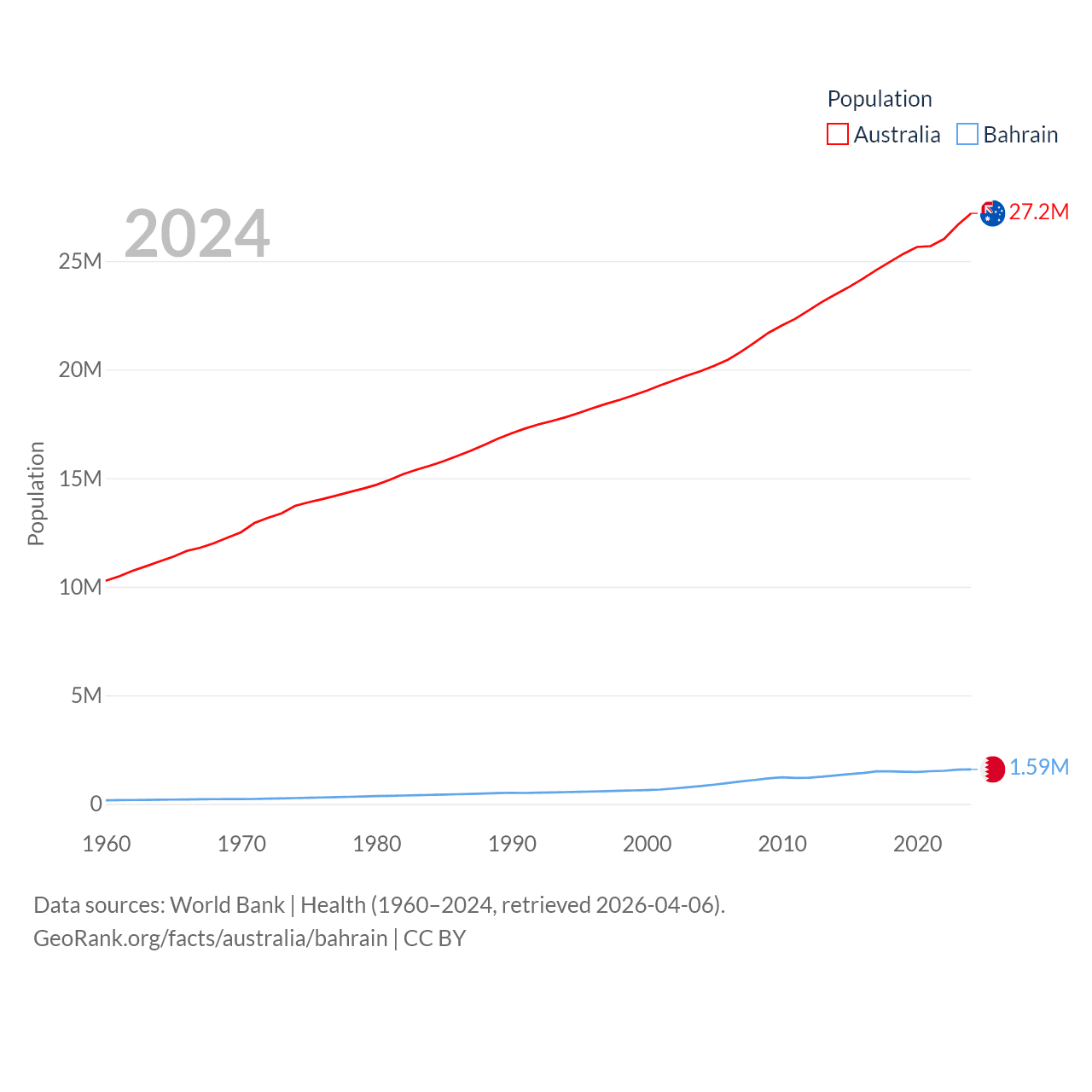 Australia has a population of 27.2M (ranked 54/197), compared with 1.59M in Bahrain (ranked 151/197). Australia's land area is 2,969,906 sq mi versus 309 sq mi for Bahrain (ranked 6th vs. 174th).