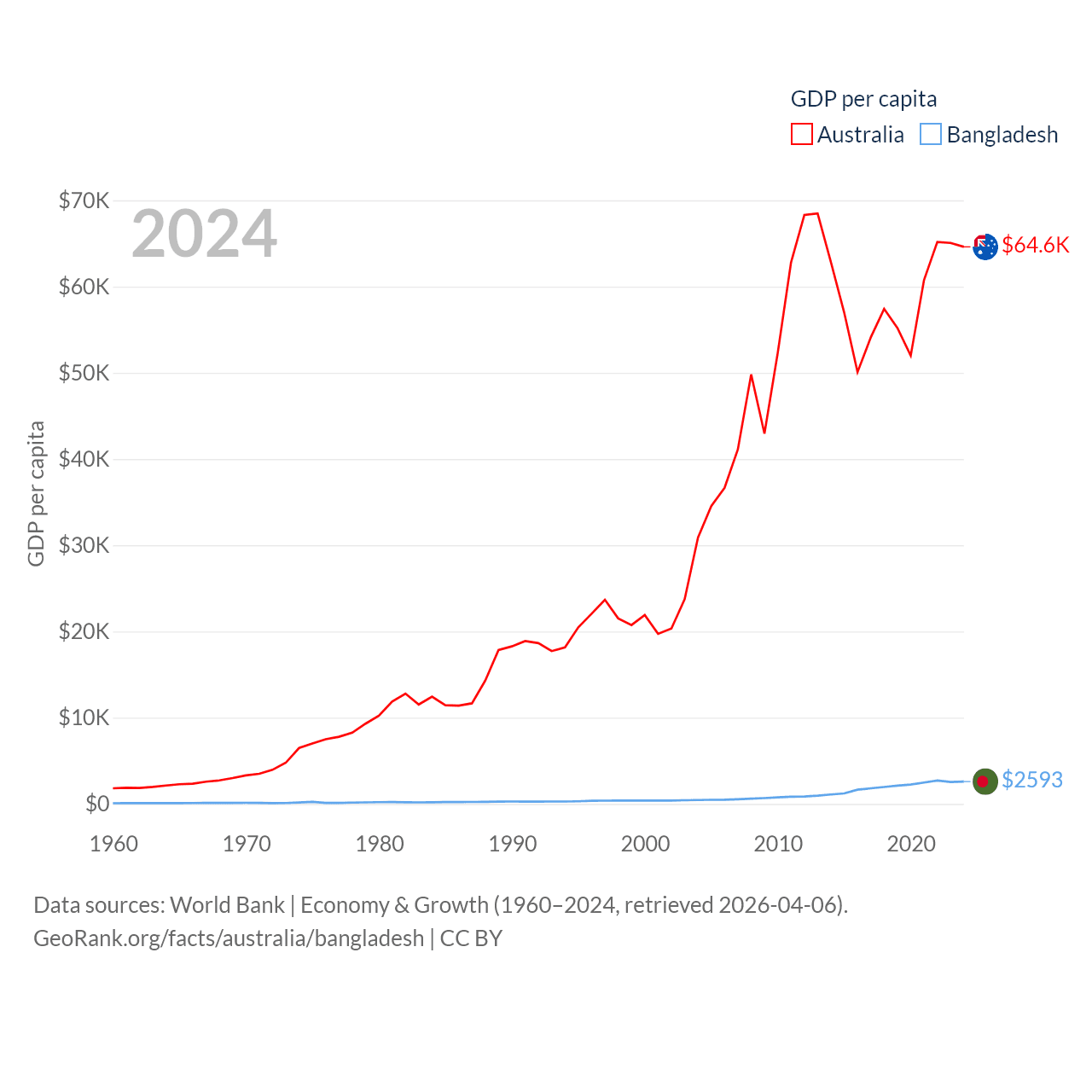 By GDP, Australia ranks 14/197 ($1.76T) and Bangladesh ranks 36/197 ($450B). By GDP per capita, Australia ranks 14/197 ($64,604), while Bangladesh ranks 146/197 ($2,593).
