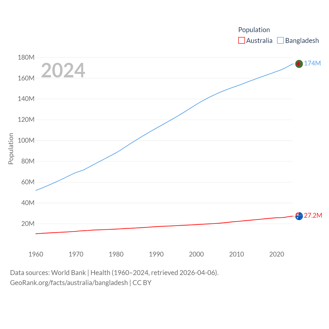 Australia has a population of 27.2M (ranked 54/197), compared with 174M in Bangladesh (ranked 8/197). Australia's land area is 2,969,906 sq mi versus 50,186 sq mi for Bangladesh (ranked 6th vs. 94th).