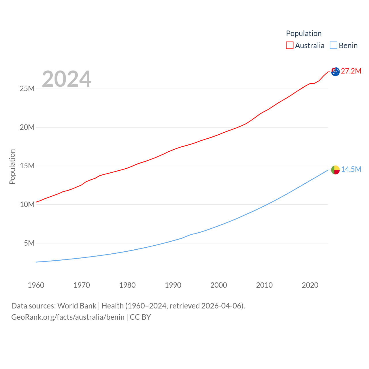 Australia has a population of 27.2M (ranked 54/197), compared with 14.5M in Benin (ranked 76/197). Australia's land area is 2,969,906 sq mi versus 43,537 sq mi for Benin (ranked 6th vs. 99th).