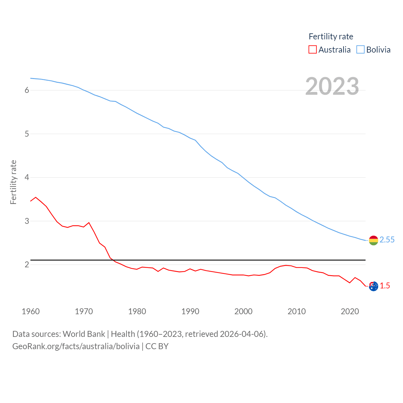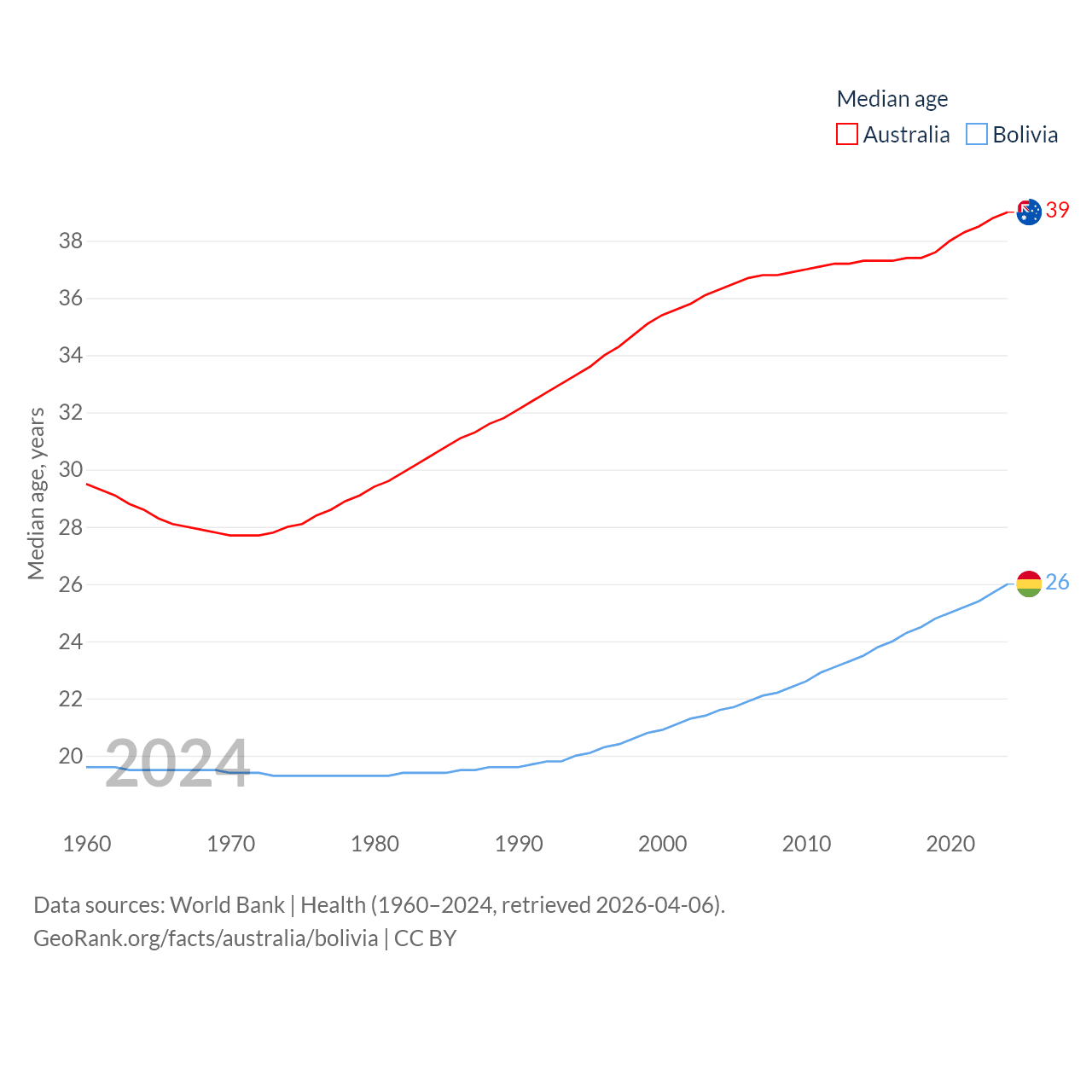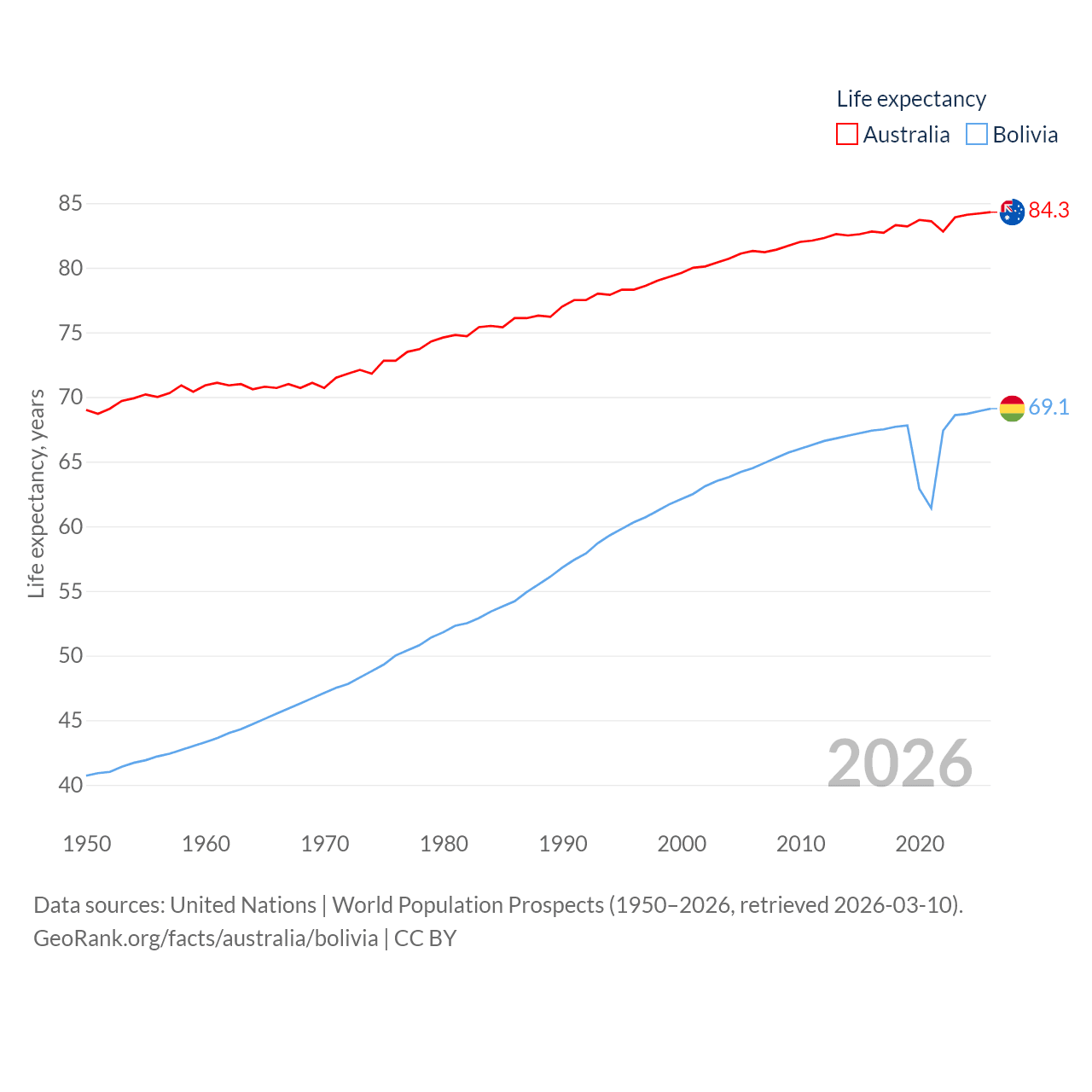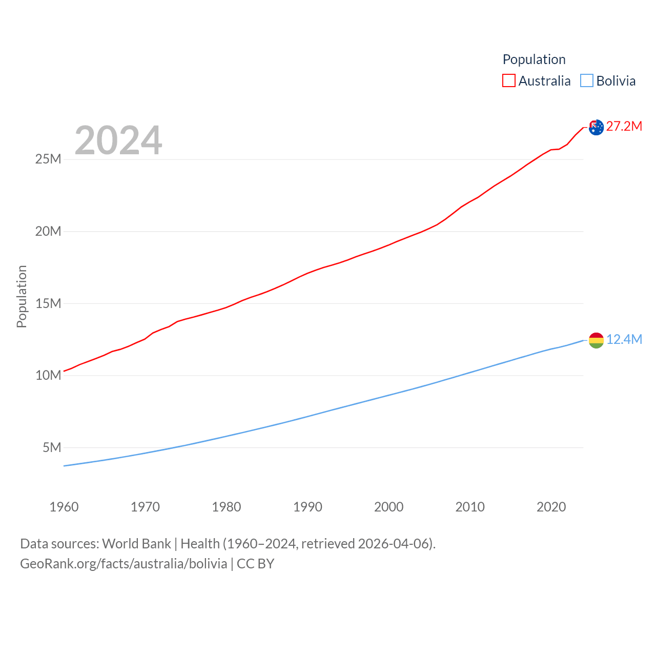 Australia has a population of 27.2M (ranked 54/197), compared with 12.4M in Bolivia (ranked 79/197). Australia's land area is 2,969,906 sq mi versus 418,264 sq mi for Bolivia (ranked 6th vs. 27th).