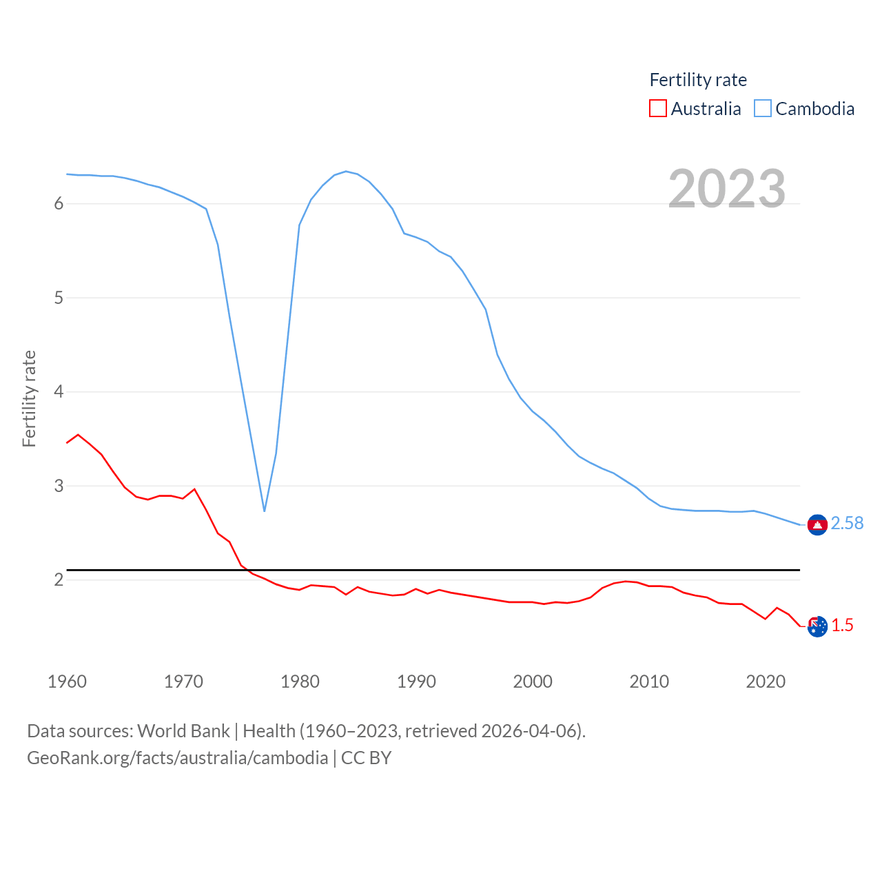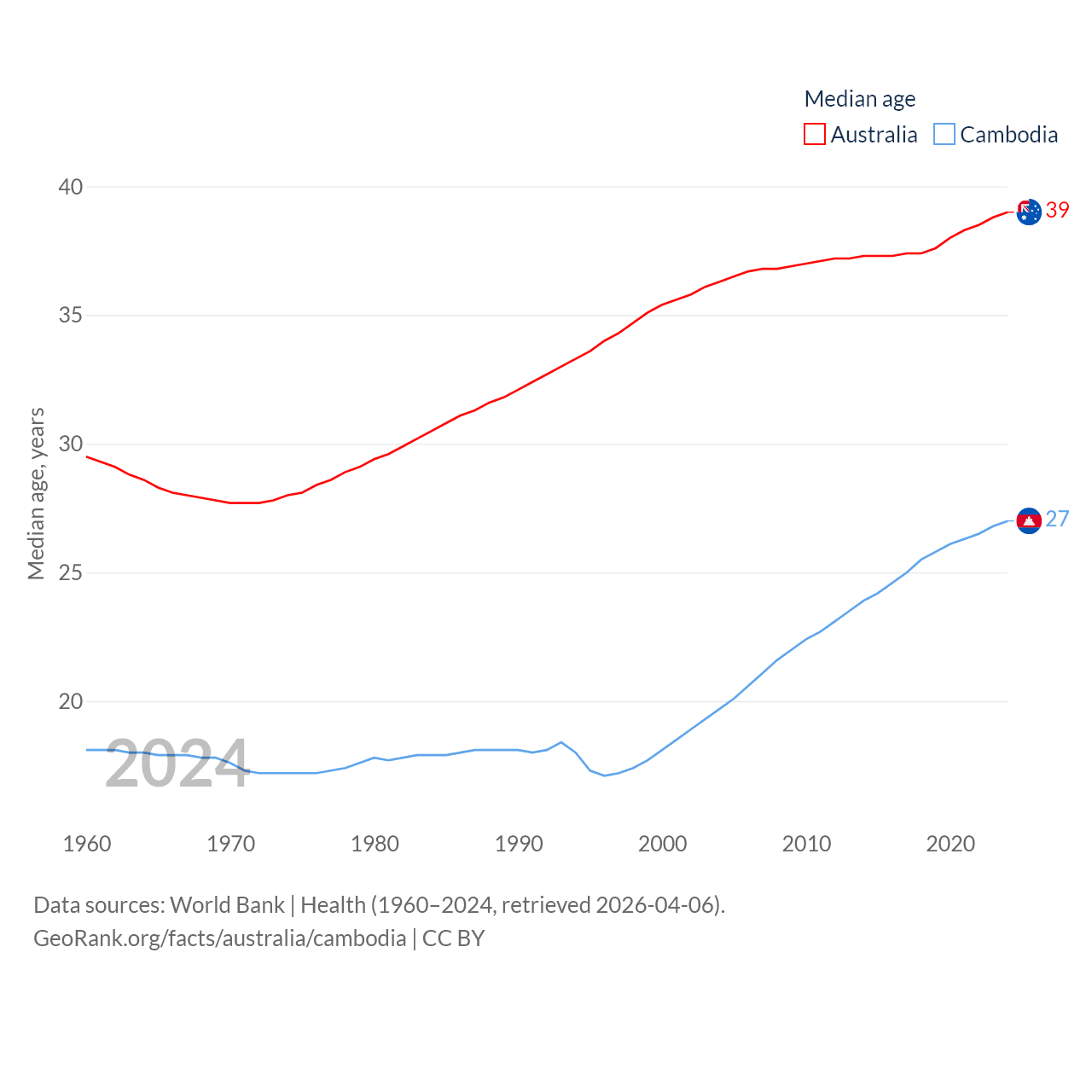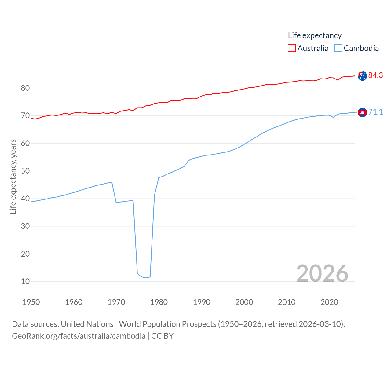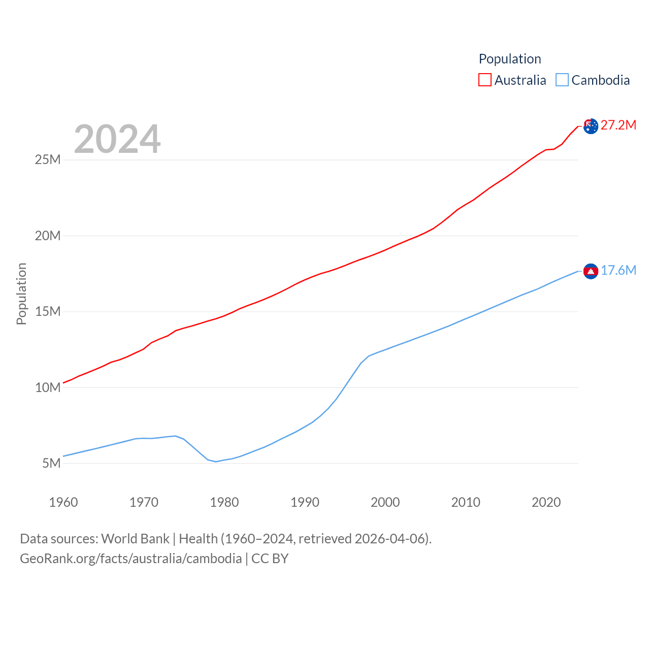 Australia has a population of 27.2M (ranked 54/197), compared with 17.6M in Cambodia (ranked 73/197). Australia's land area is 2,969,906 sq mi versus 68,155 sq mi for Cambodia (ranked 6th vs. 88th).