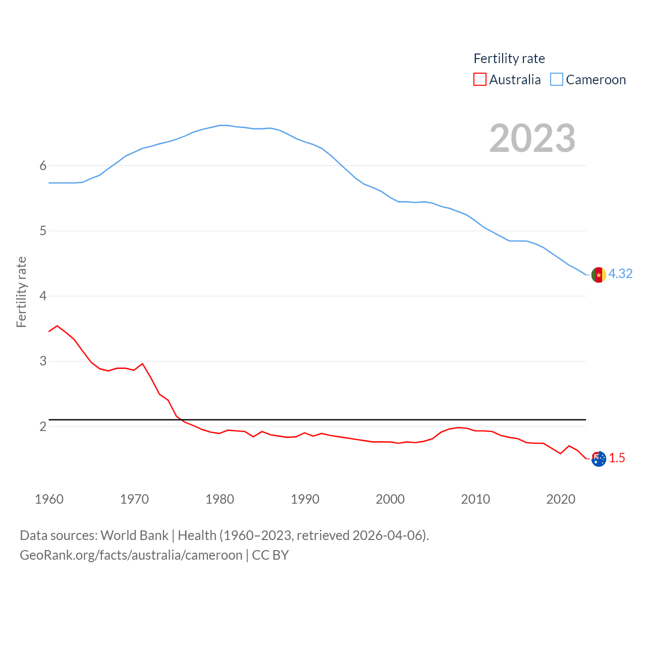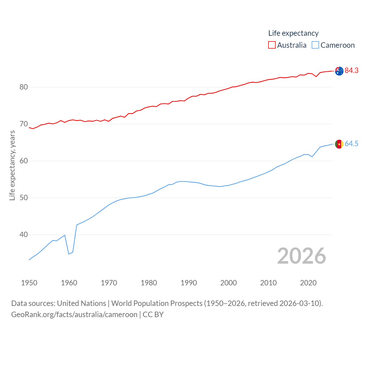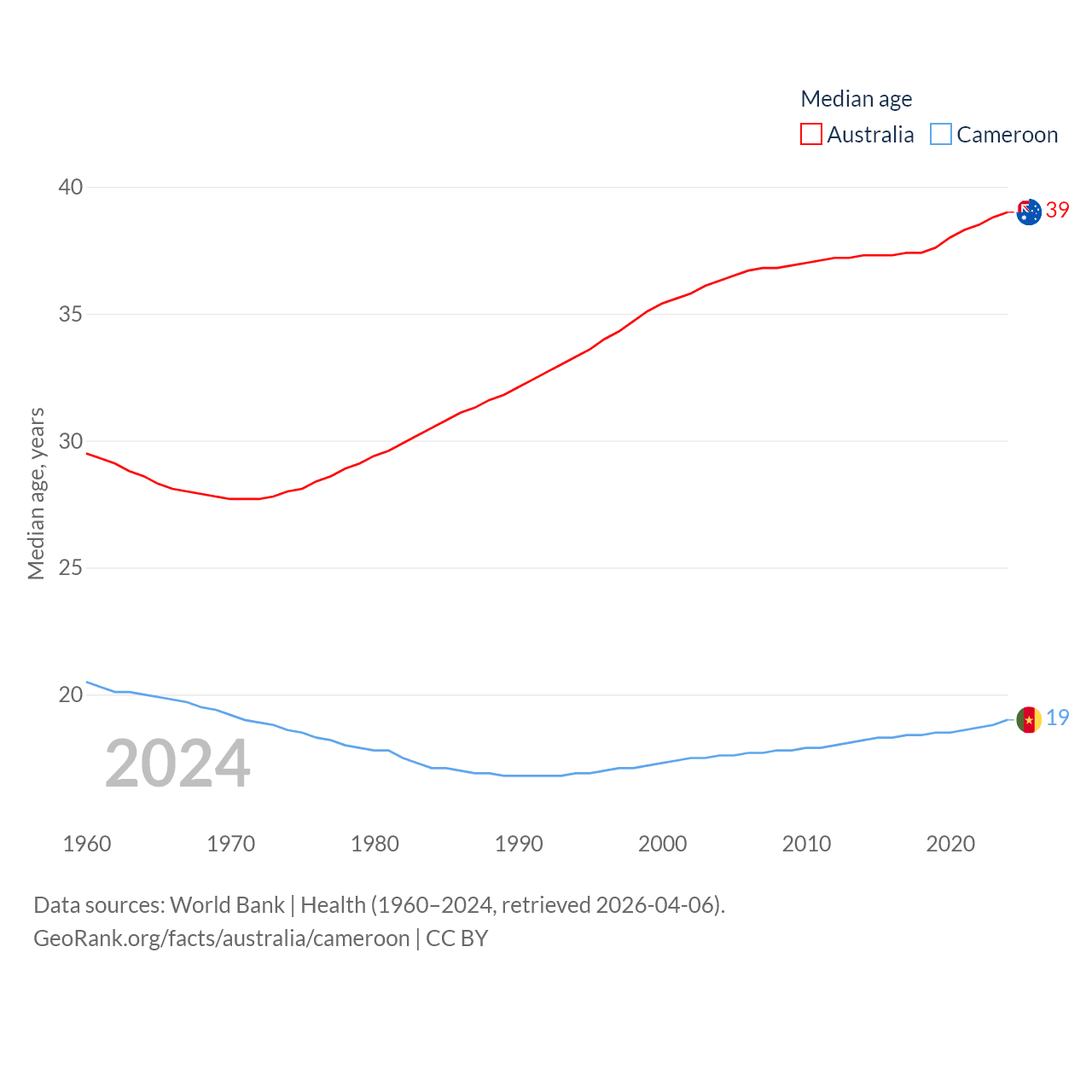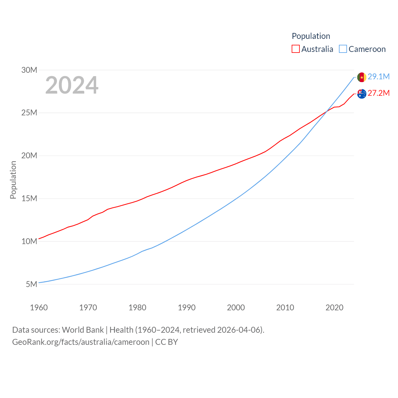 Australia has a population of 27.2M (ranked 54/197), compared with 29.1M in Cameroon (ranked 52/197). Australia's land area is 2,969,906 sq mi versus 182,514 sq mi for Cameroon (ranked 6th vs. 52nd).
