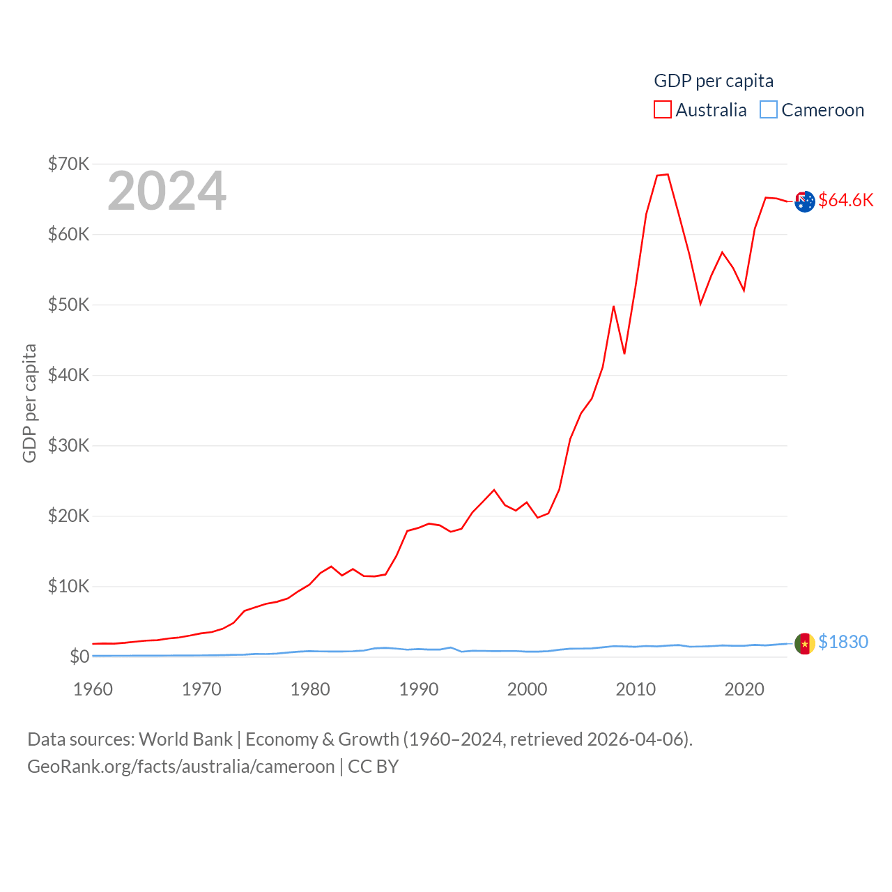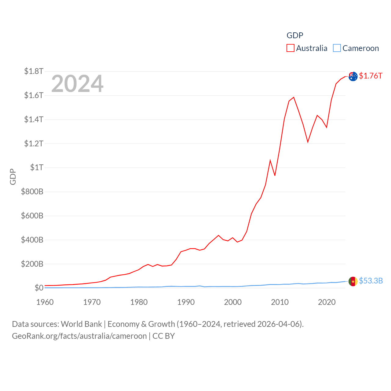 By GDP, Australia ranks 14/197 ($1.76T) and Cameroon ranks 91/197 ($53.3B). By GDP per capita, Australia ranks 14/197 ($64,604), while Cameroon ranks 158/197 ($1,830).