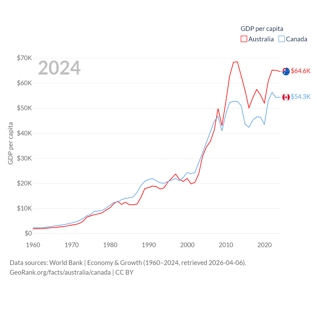 By GDP, Australia ranks 14/197 ($1.76T) and Canada ranks 9/197 ($2.24T). By GDP per capita, Australia ranks 14/197 ($64,604), while Canada ranks 20/197 ($54,340).