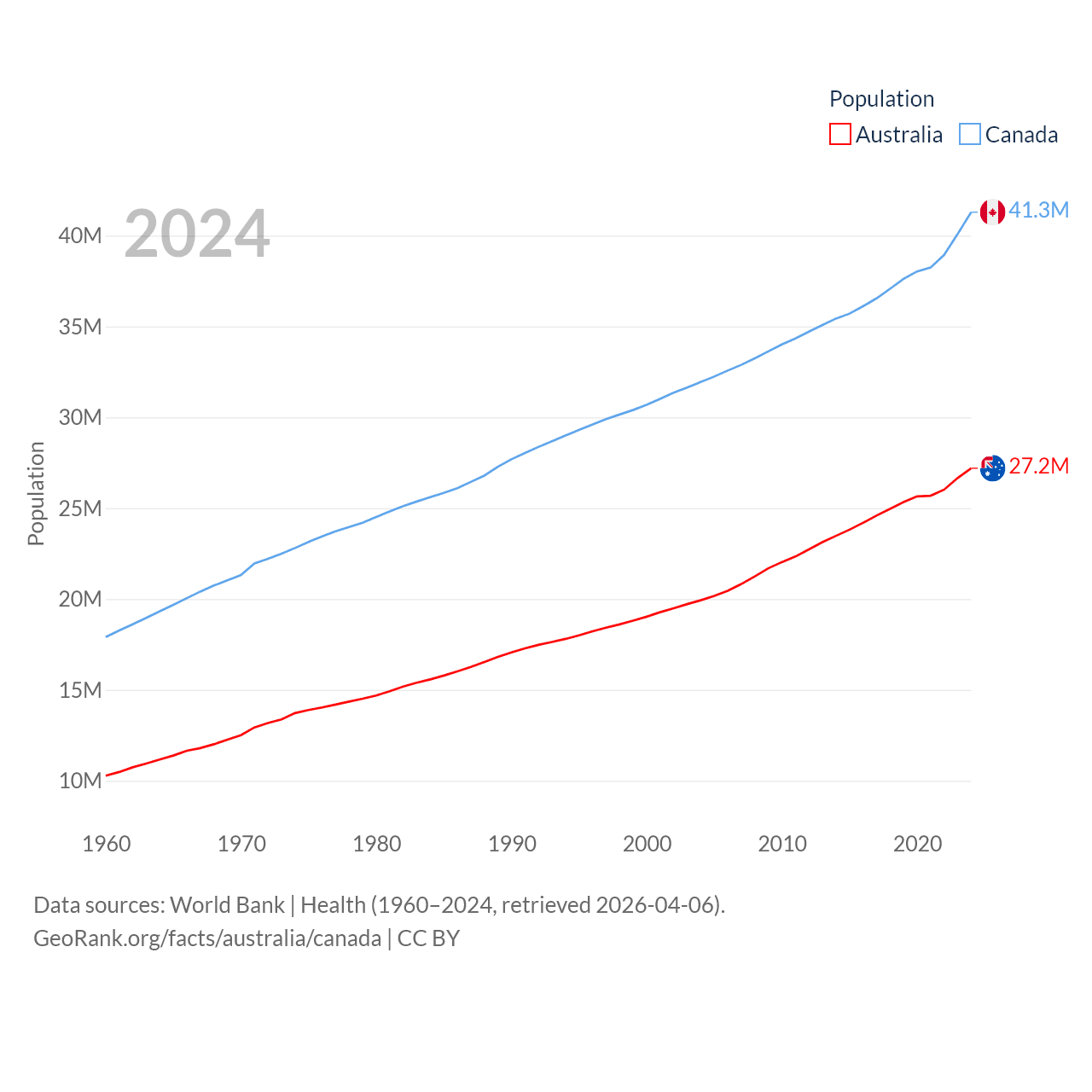 Australia has a population of 27.2M (ranked 54/197), compared with 41.3M in Canada (ranked 37/197). Australia's land area is 2,969,906 sq mi versus 3,393,336 sq mi for Canada (ranked 6th vs. 4th).
