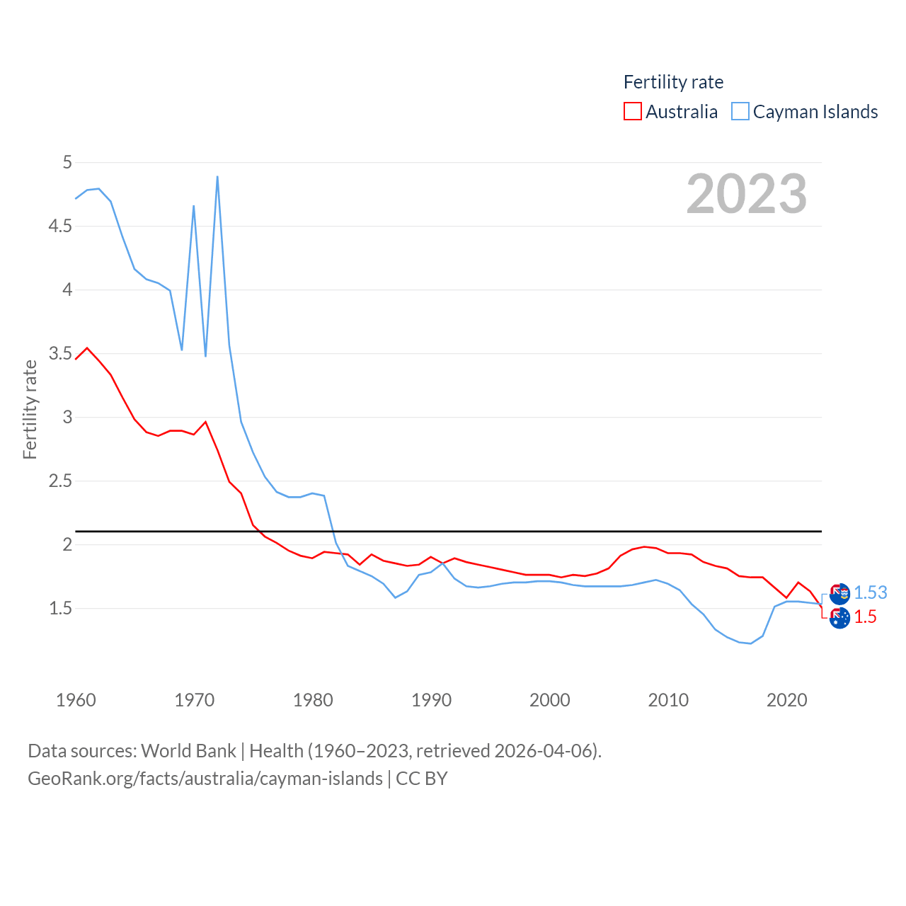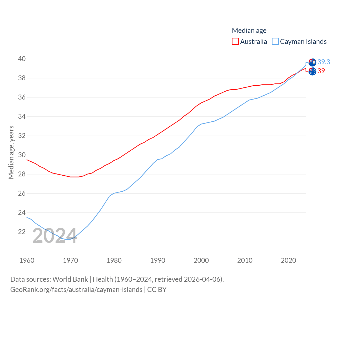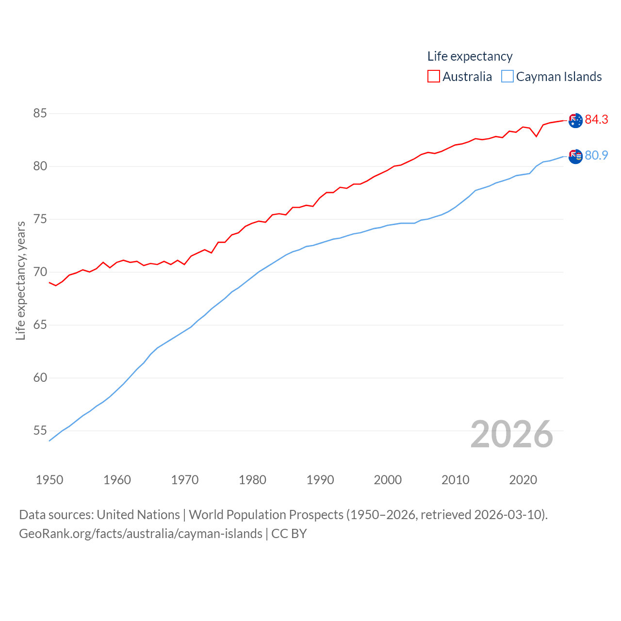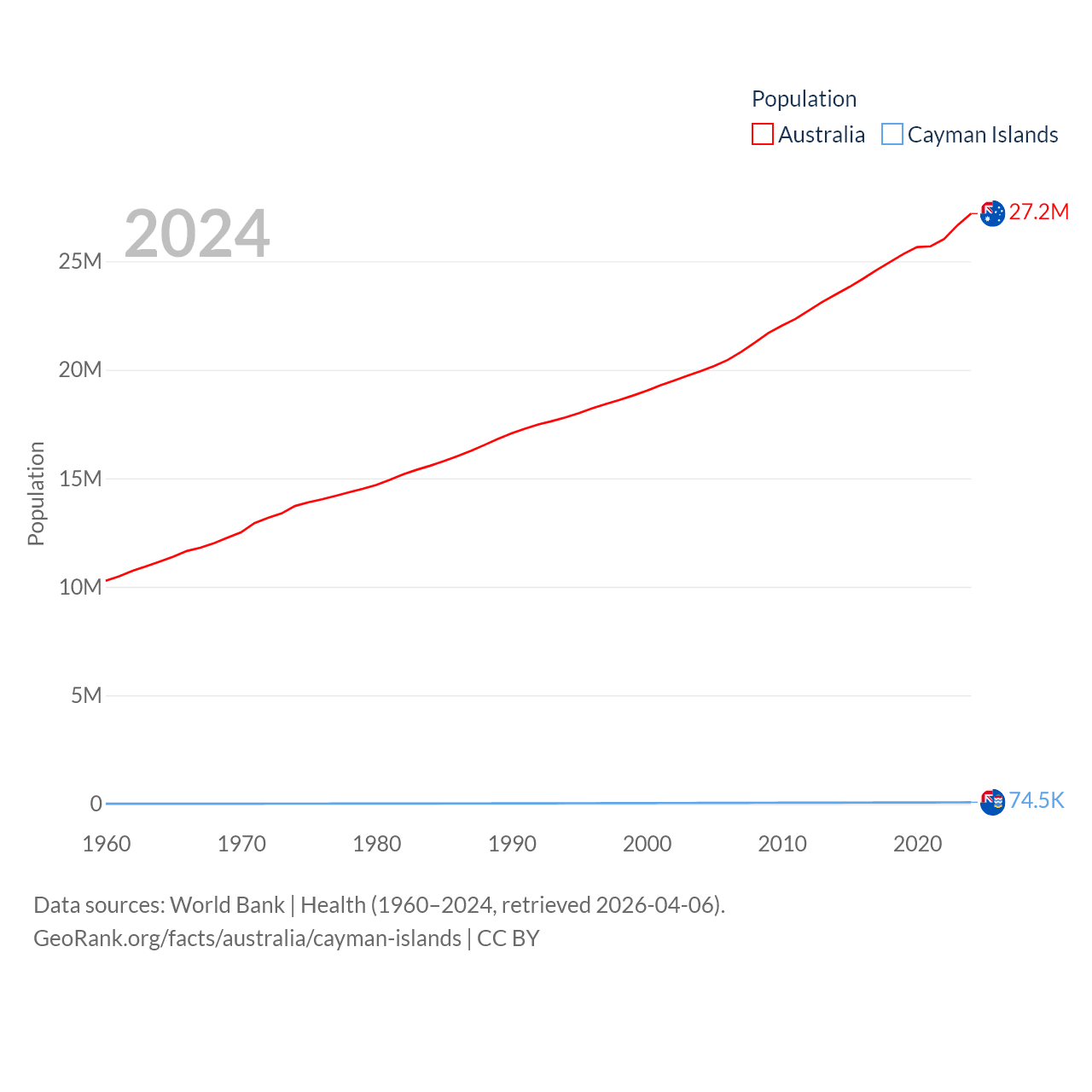 Australia has a population of 27.2M (ranked 54/197), compared with 74.5K in The Cayman Islands (ranked 187/197). Australia's land area is 2,969,906 sq mi versus 92.7 sq mi for The Cayman Islands (ranked 6th vs. 190th).