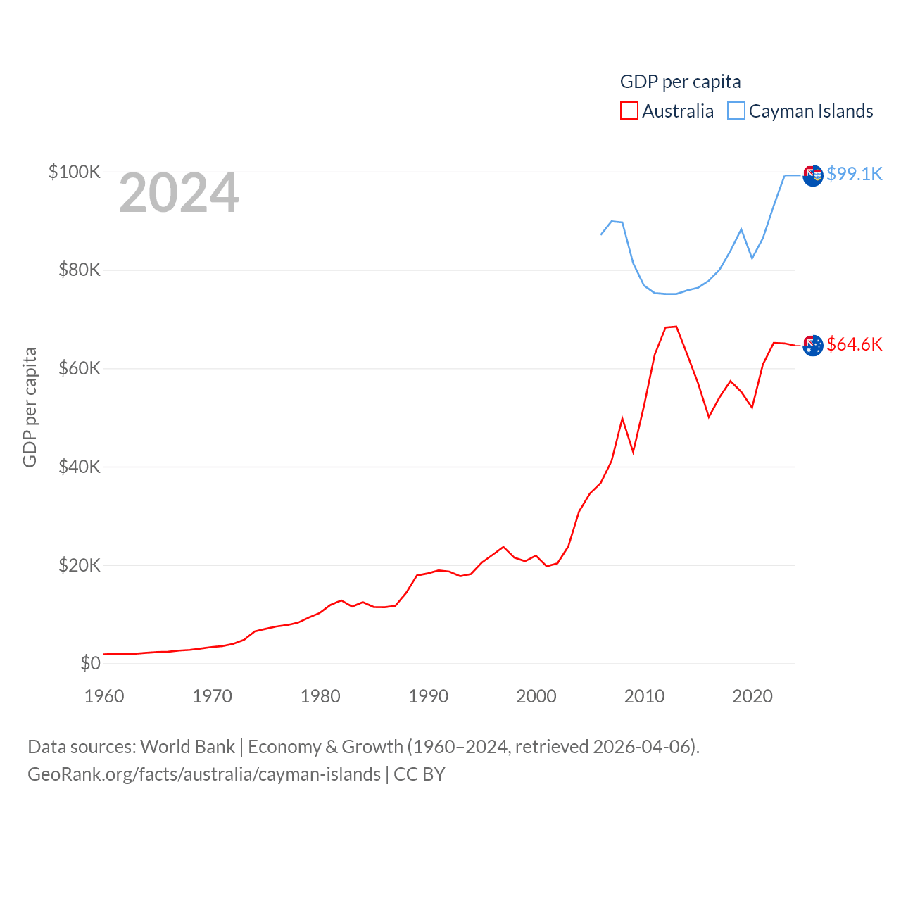 By GDP, Australia ranks 14/197 ($1.76T) and The Cayman Islands ranks 158/197 ($7.24B). By GDP per capita, Australia ranks 14/197 ($64,604), while The Cayman Islands ranks 6/197 ($99,144).