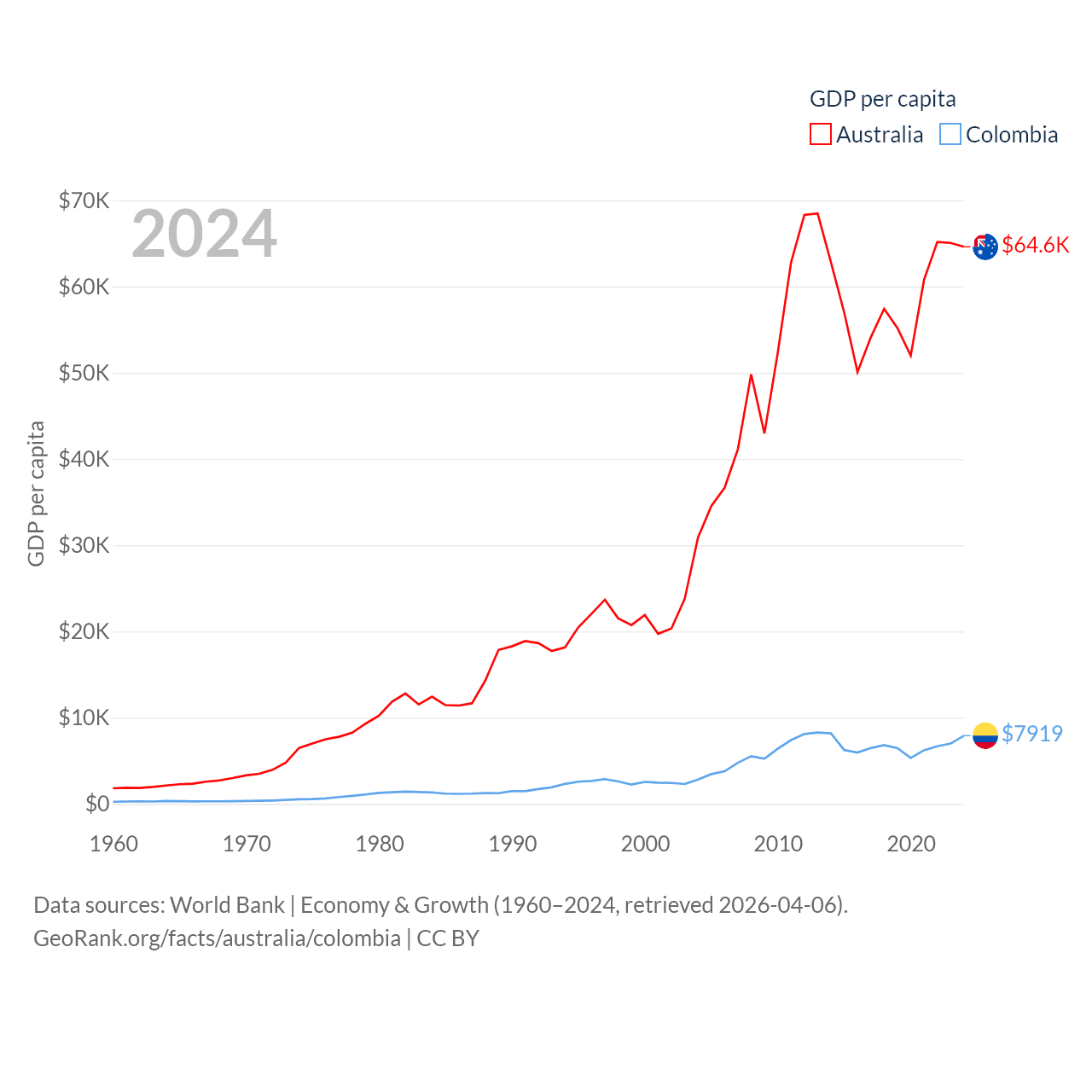By GDP, Australia ranks 14/197 ($1.76T) and Colombia ranks 39/197 ($419B). By GDP per capita, Australia ranks 14/197 ($64,604), while Colombia ranks 94/197 ($7,919).