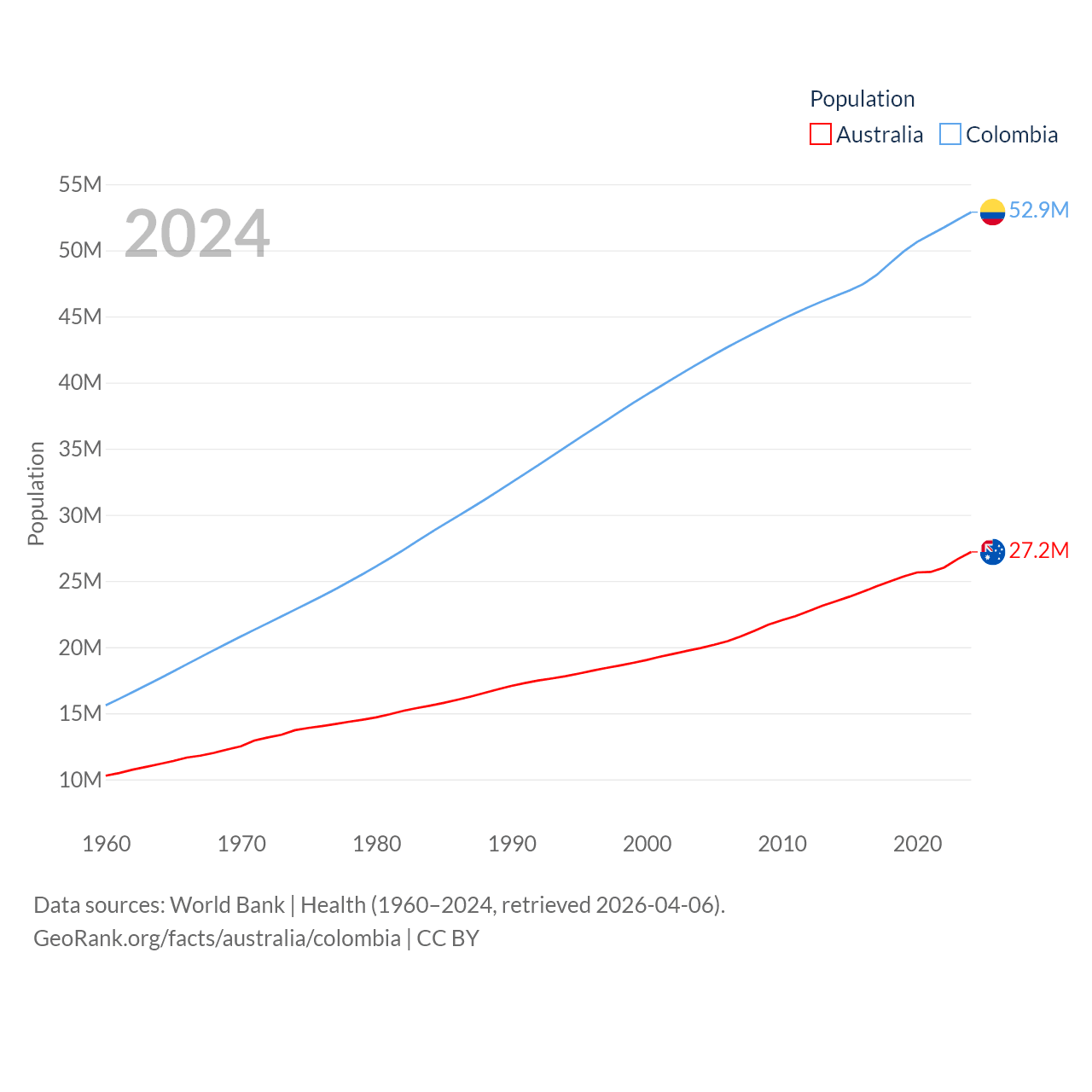 Australia has a population of 27.2M (ranked 54/197), compared with 52.9M in Colombia (ranked 28/197). Australia's land area is 2,969,906 sq mi versus 428,380 sq mi for Colombia (ranked 6th vs. 26th).