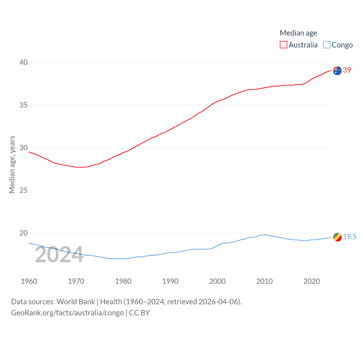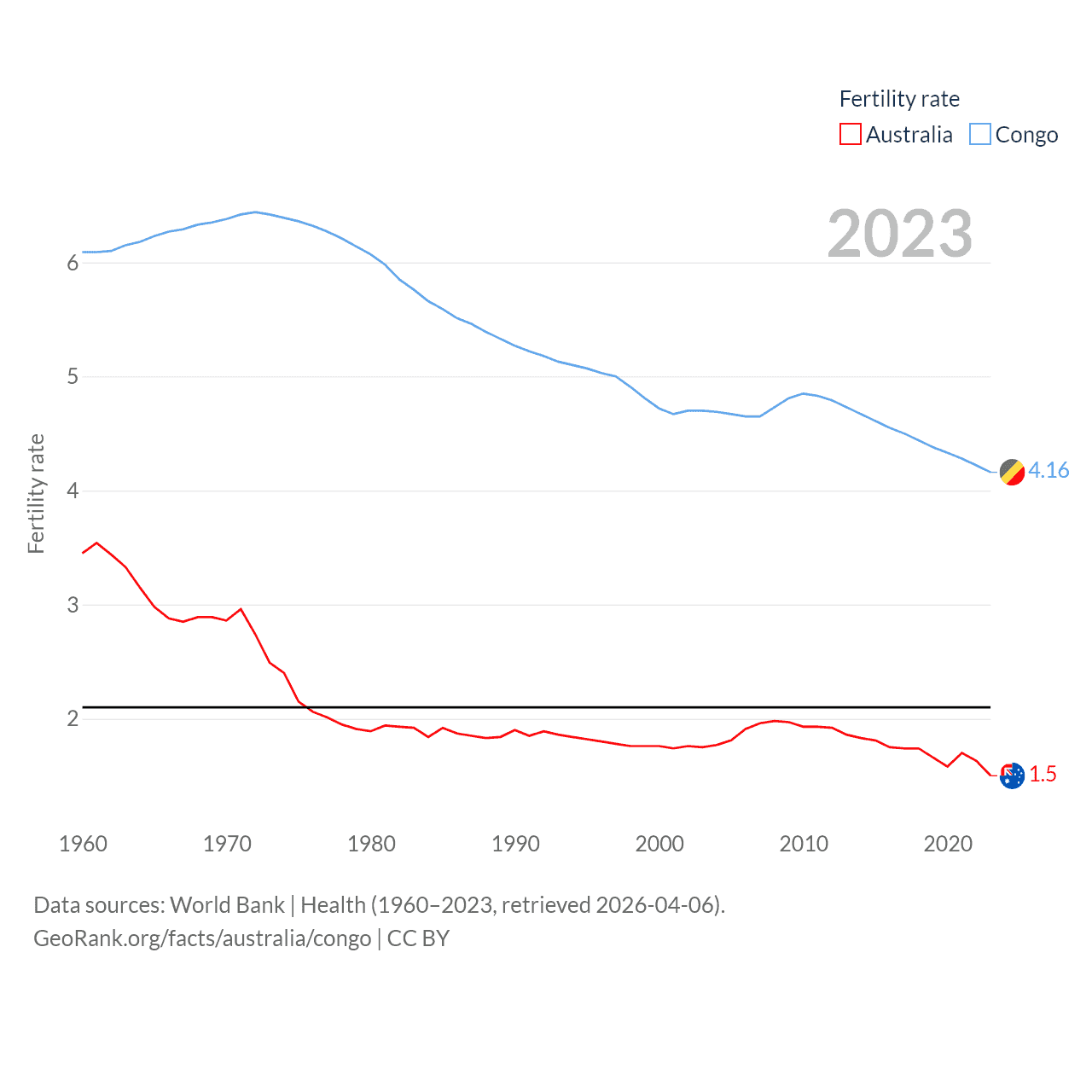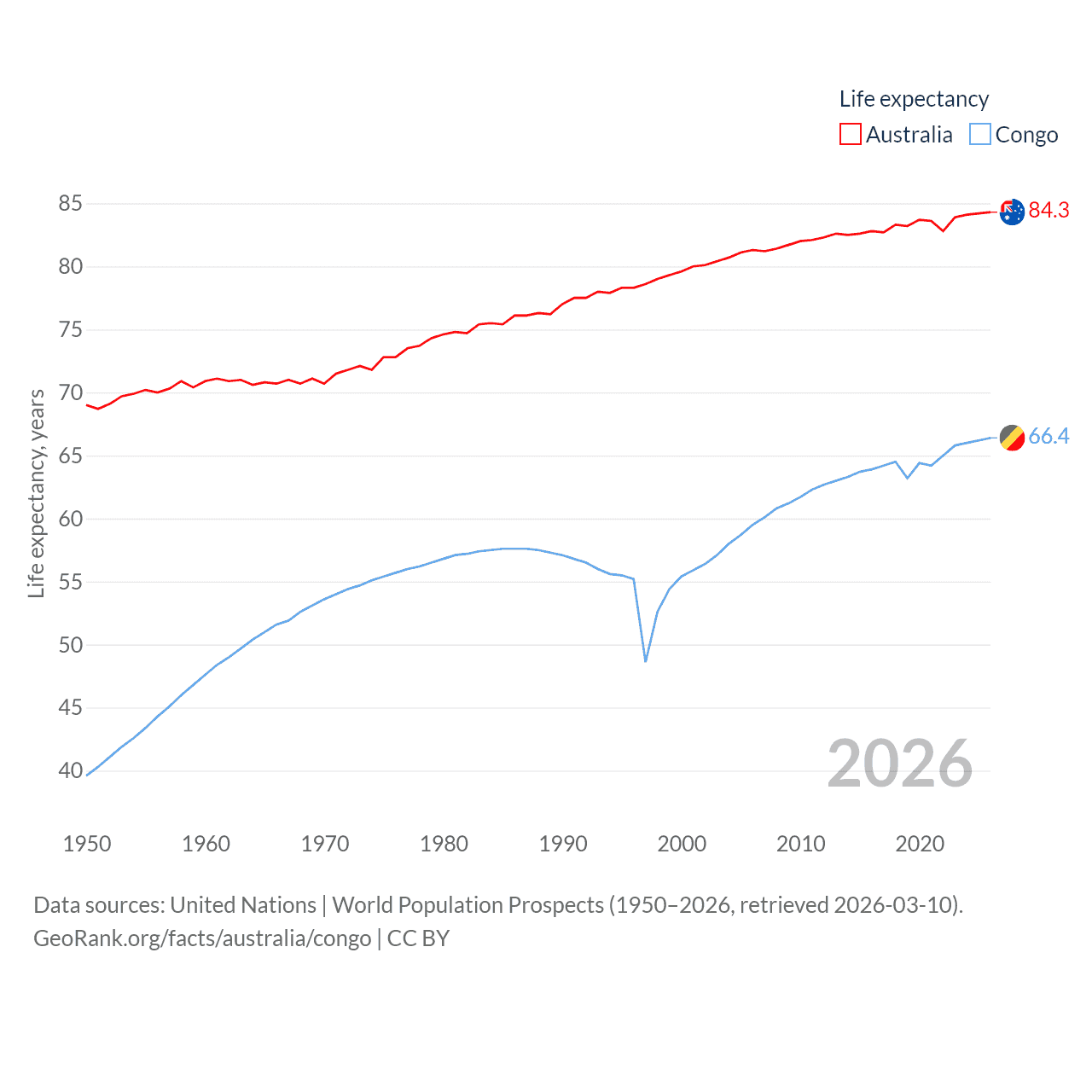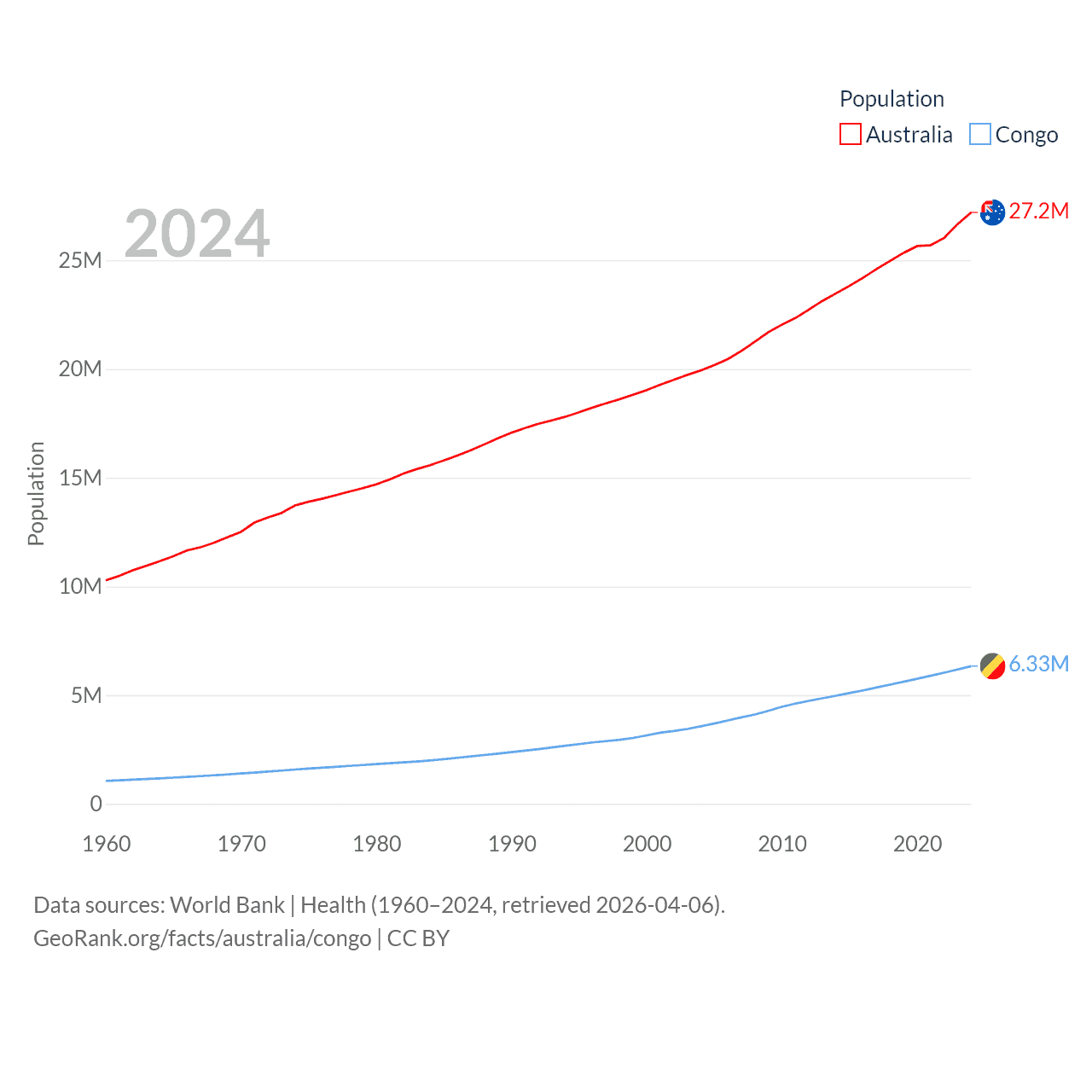 Australia has a population of 27.2M (ranked 54/197), compared with 6.33M in The Congo (ranked 112/197). Australia's land area is 2,969,906 sq mi versus 131,854 sq mi for The Congo (ranked 6th vs. 64th).