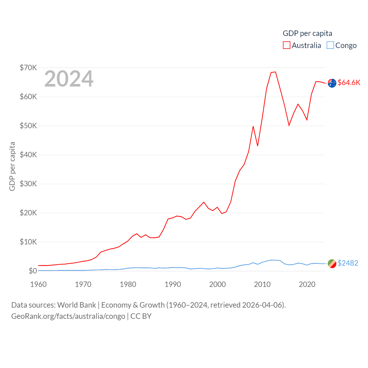 By GDP, Australia ranks 14/197 ($1.76T) and The Congo ranks 141/197 ($15.7B). By GDP per capita, Australia ranks 14/197 ($64,604), while The Congo ranks 149/197 ($2,482).