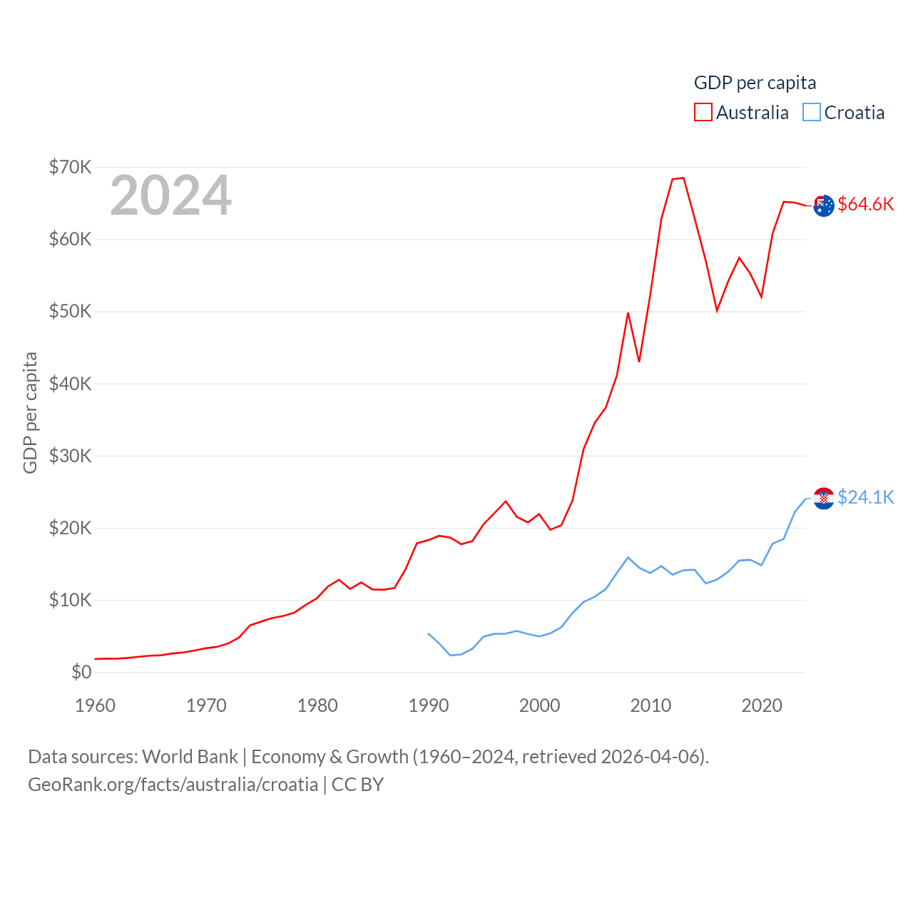 By GDP, Australia ranks 14/197 ($1.76T) and Croatia ranks 75/197 ($93B). By GDP per capita, Australia ranks 14/197 ($64,604), while Croatia ranks 50/197 ($24,050).