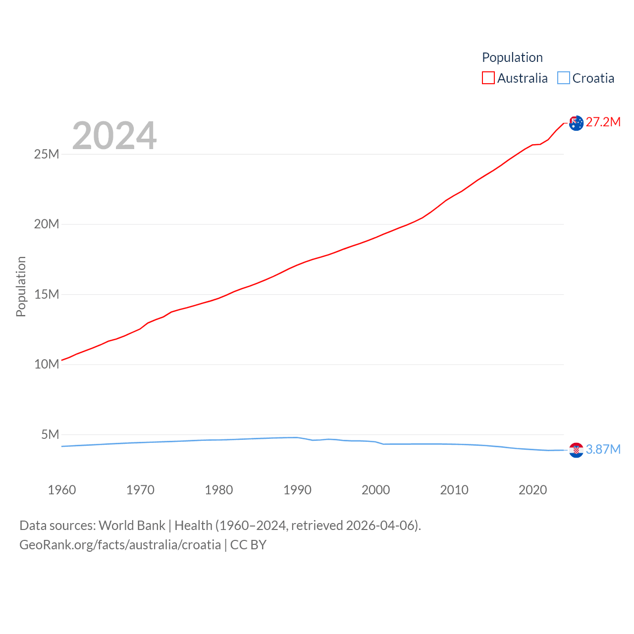 Australia has a population of 27.2M (ranked 54/197), compared with 3.87M in Croatia (ranked 129/197). Australia's land area is 2,969,906 sq mi versus 21,606 sq mi for Croatia (ranked 6th vs. 123rd).