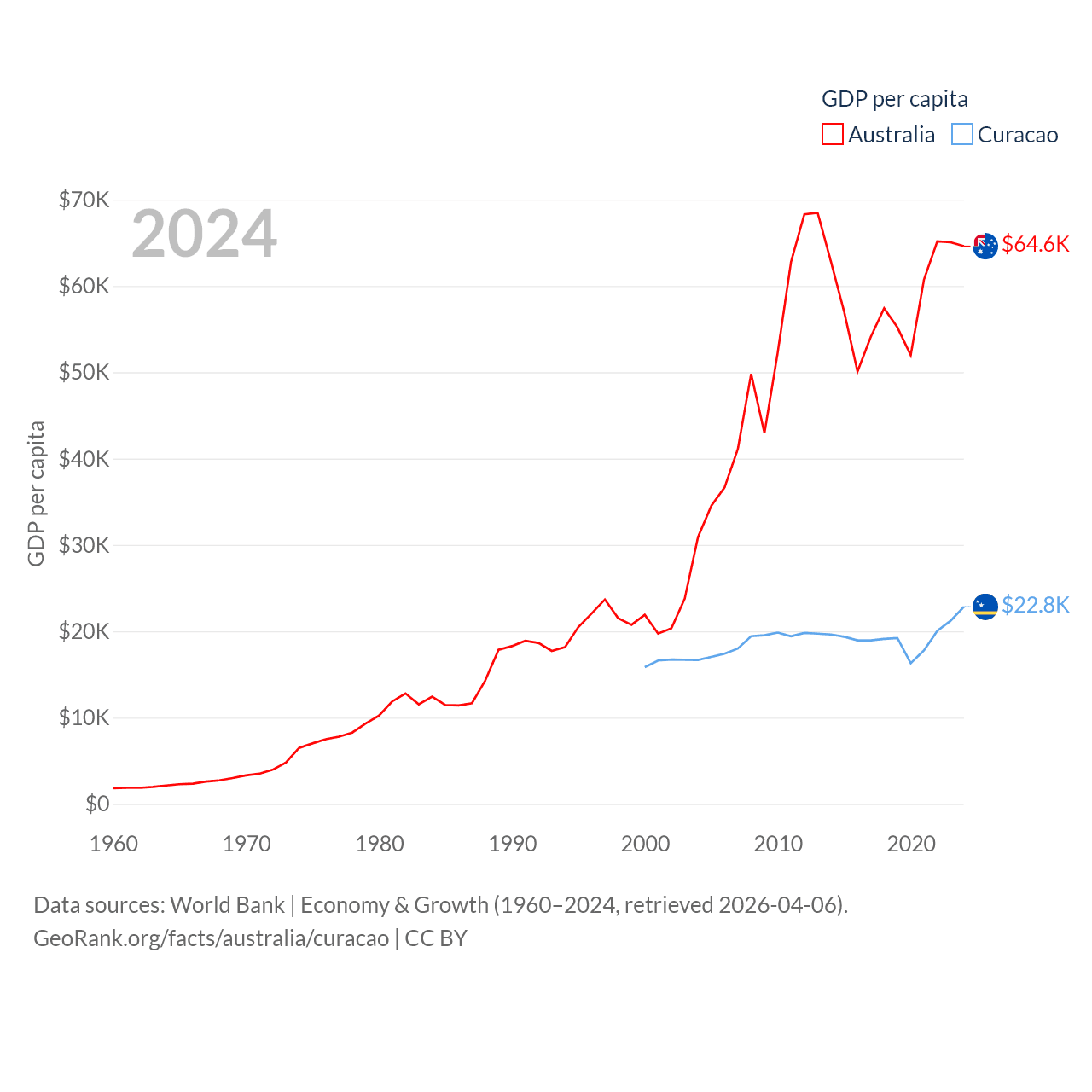 By GDP, Australia ranks 14/197 ($1.76T) and Curacao ranks 167/197 ($3.56B). By GDP per capita, Australia ranks 14/197 ($64,604), while Curacao ranks 56/197 ($22,833).