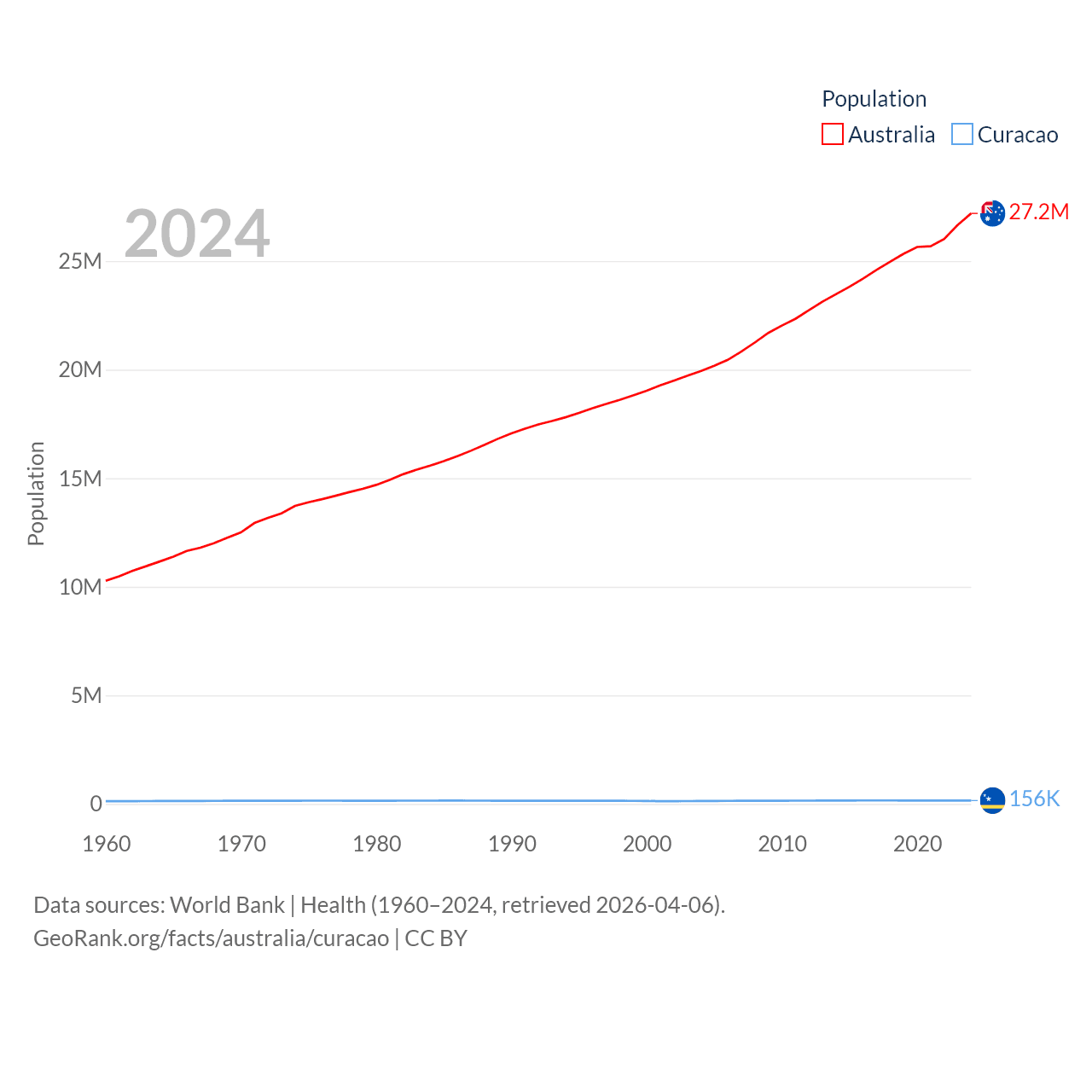 Australia has a population of 27.2M (ranked 54/197), compared with 156K in Curacao (ranked 179/197). Australia's land area is 2,969,906 sq mi versus 171.4 sq mi for Curacao (ranked 6th vs. 182nd).