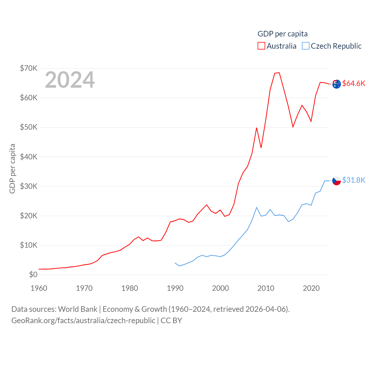By GDP, Australia ranks 14/197 ($1.76T) and The Czech Republic ranks 44/197 ($347B). By GDP per capita, Australia ranks 14/197 ($64,604), while The Czech Republic ranks 39/197 ($31,823).
