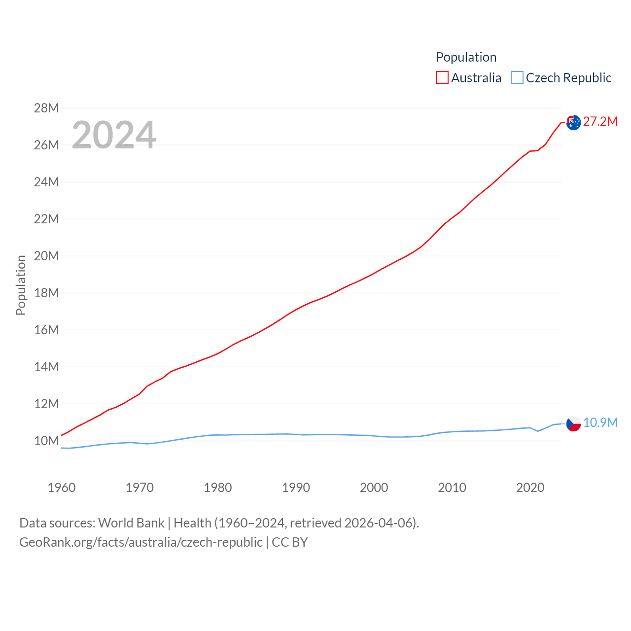 Australia has a population of 27.2M (ranked 54/197), compared with 10.9M in The Czech Republic (ranked 88/197). Australia's land area is 2,969,906 sq mi versus 29,794 sq mi for The Czech Republic (ranked 6th vs. 114th).
