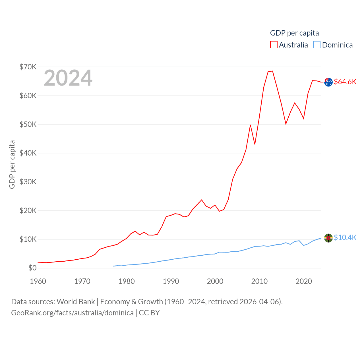 By GDP, Australia ranks 14/197 ($1.76T) and Dominica ranks 190/197 ($689M). By GDP per capita, Australia ranks 14/197 ($64,604), while Dominica ranks 84/197 ($10,405).