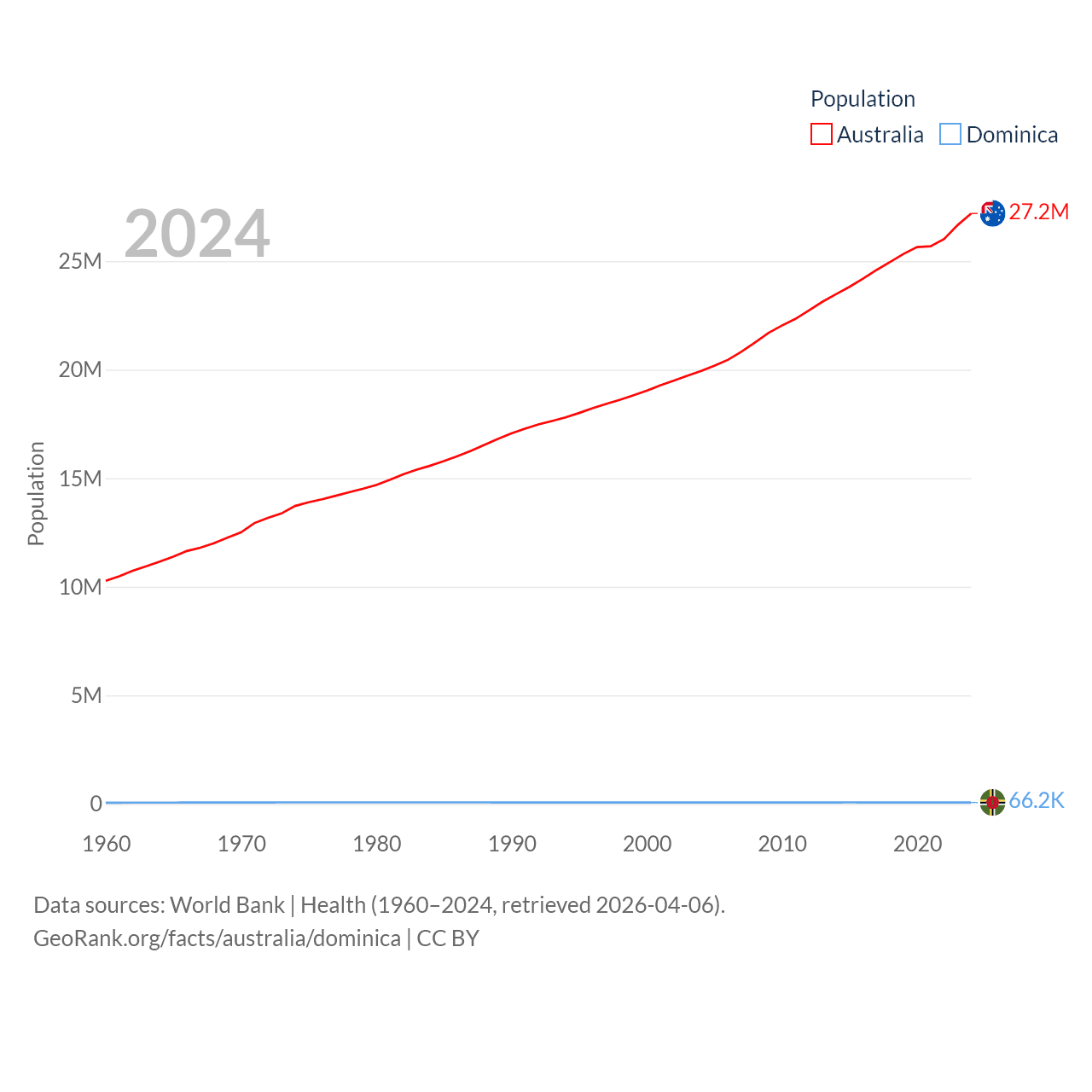 Australia has a population of 27.2M (ranked 54/197), compared with 66.2K in Dominica (ranked 188/197). Australia's land area is 2,969,906 sq mi versus 289.6 sq mi for Dominica (ranked 6th vs. 175th).