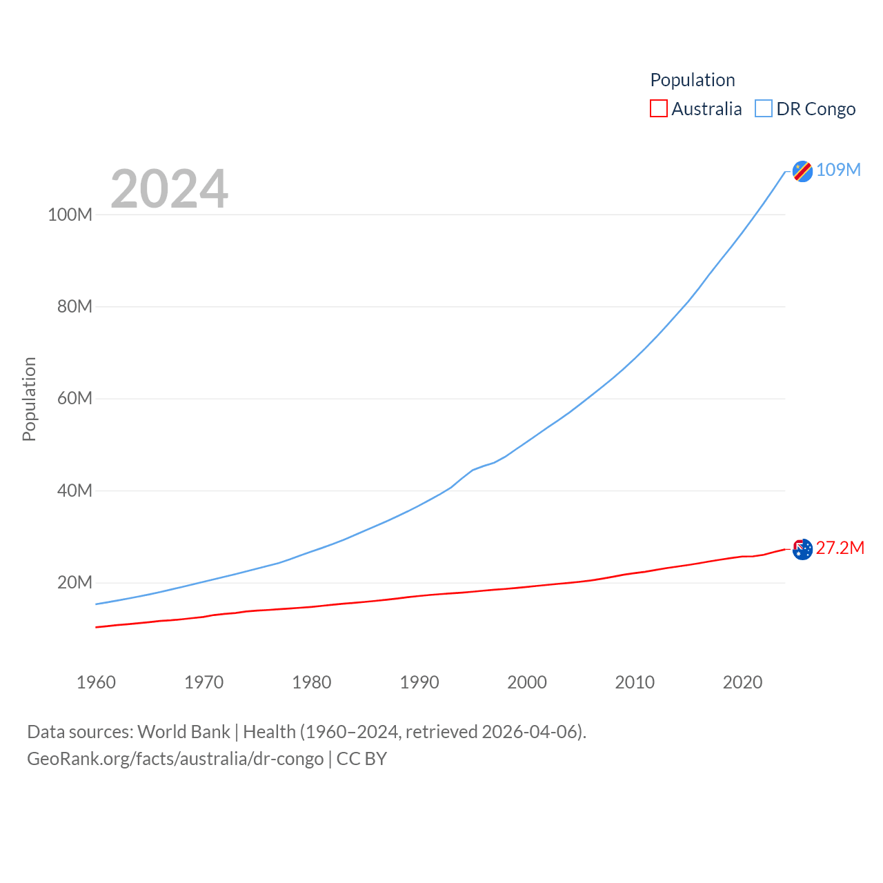 Australia has a population of 27.2M (ranked 54/197), compared with 109M in The DR Congo (ranked 15/197). Australia's land area is 2,969,906 sq mi versus 875,313 sq mi for The DR Congo (ranked 6th vs. 11th).