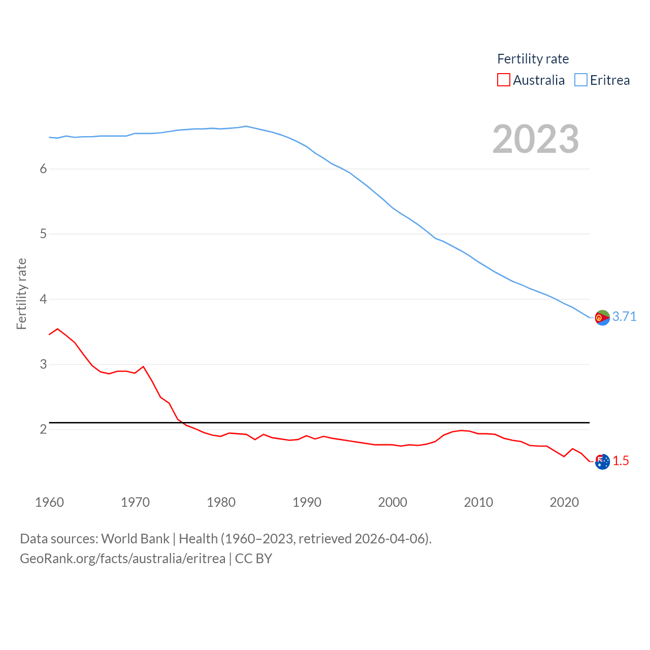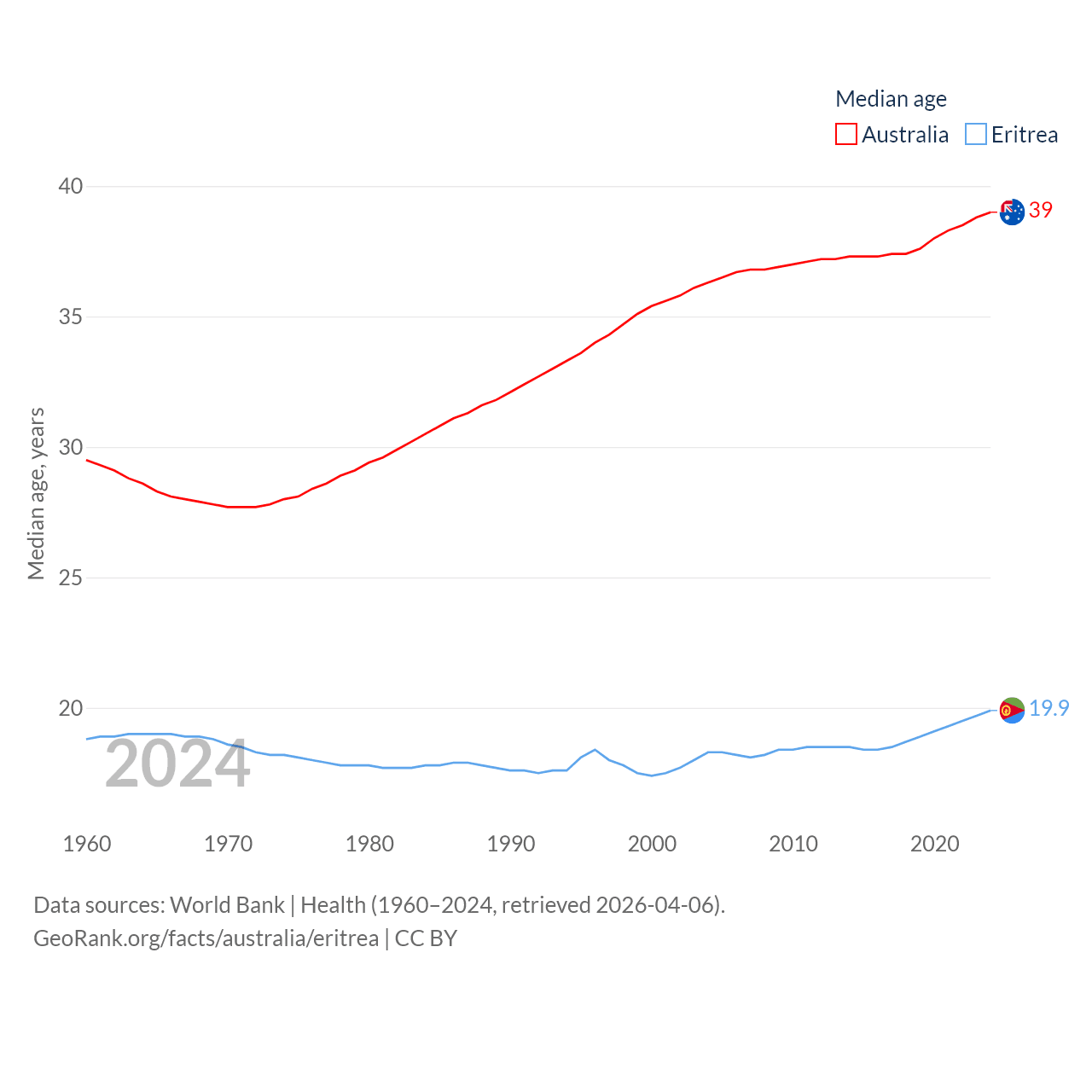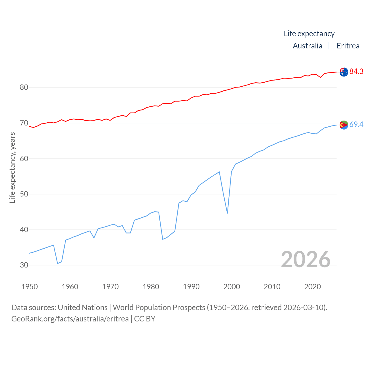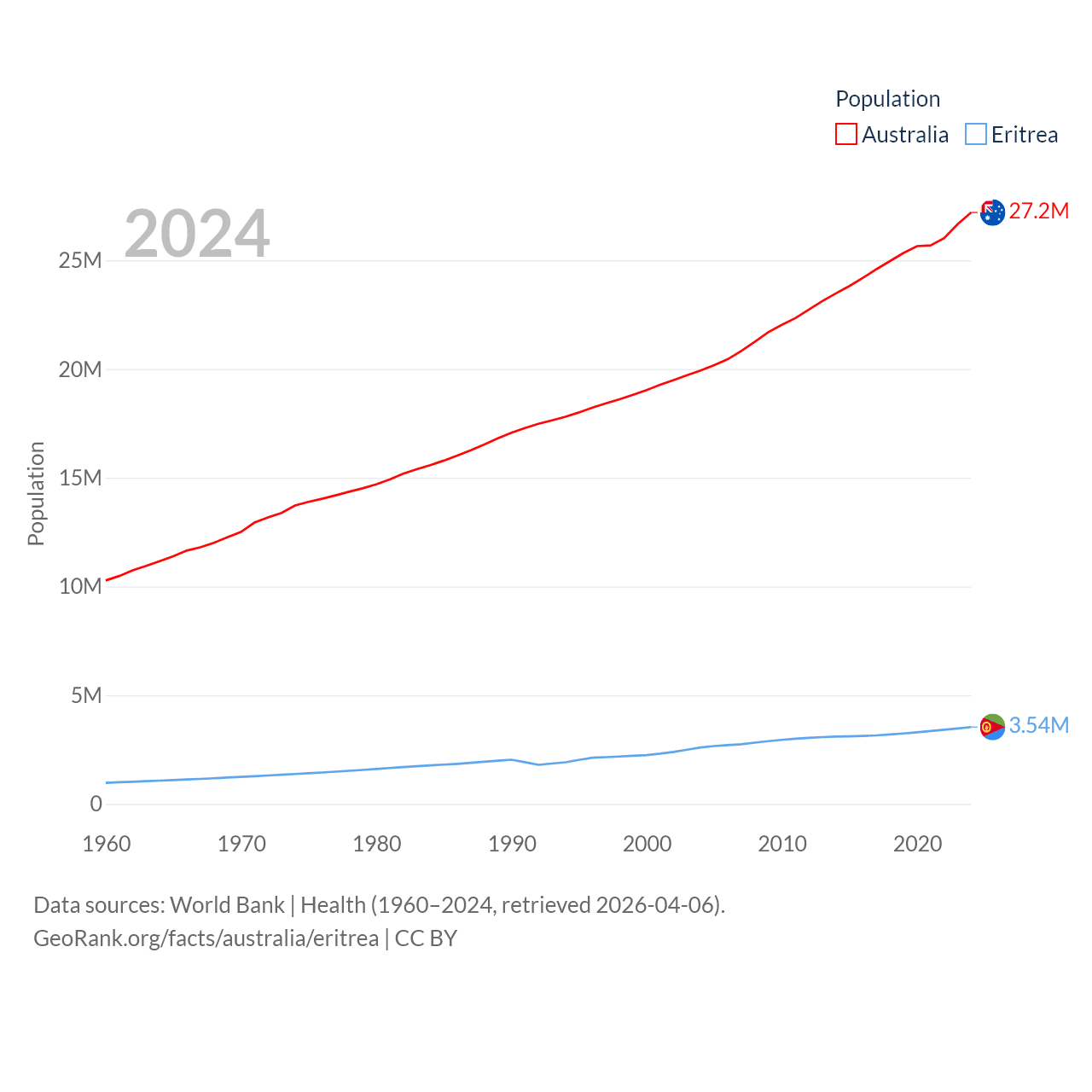 Australia has a population of 27.2M (ranked 54/197), compared with 3.54M in Eritrea (ranked 131/197). Australia's land area is 2,969,906 sq mi versus 46,787 sq mi for Eritrea (ranked 6th vs. 96th).