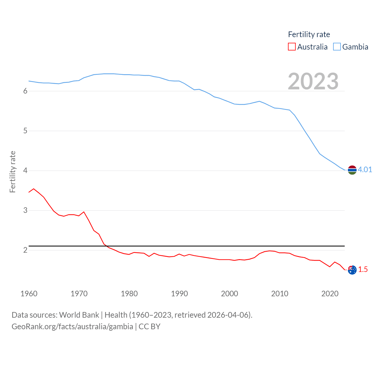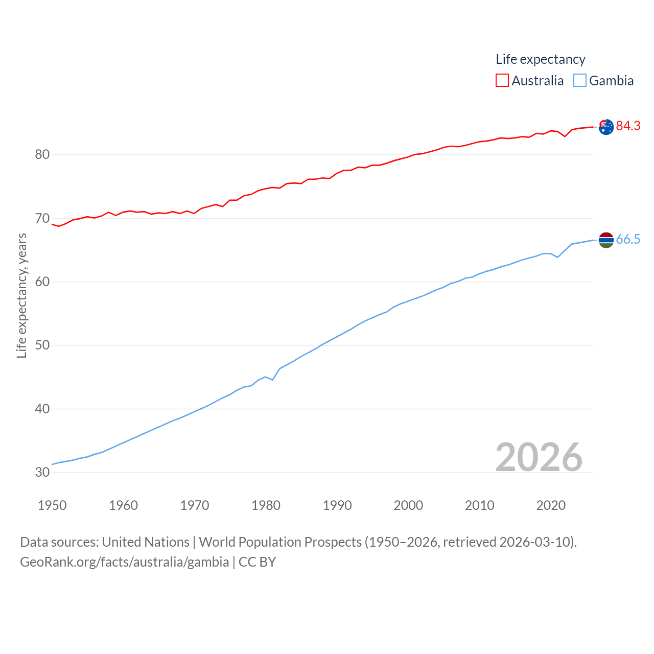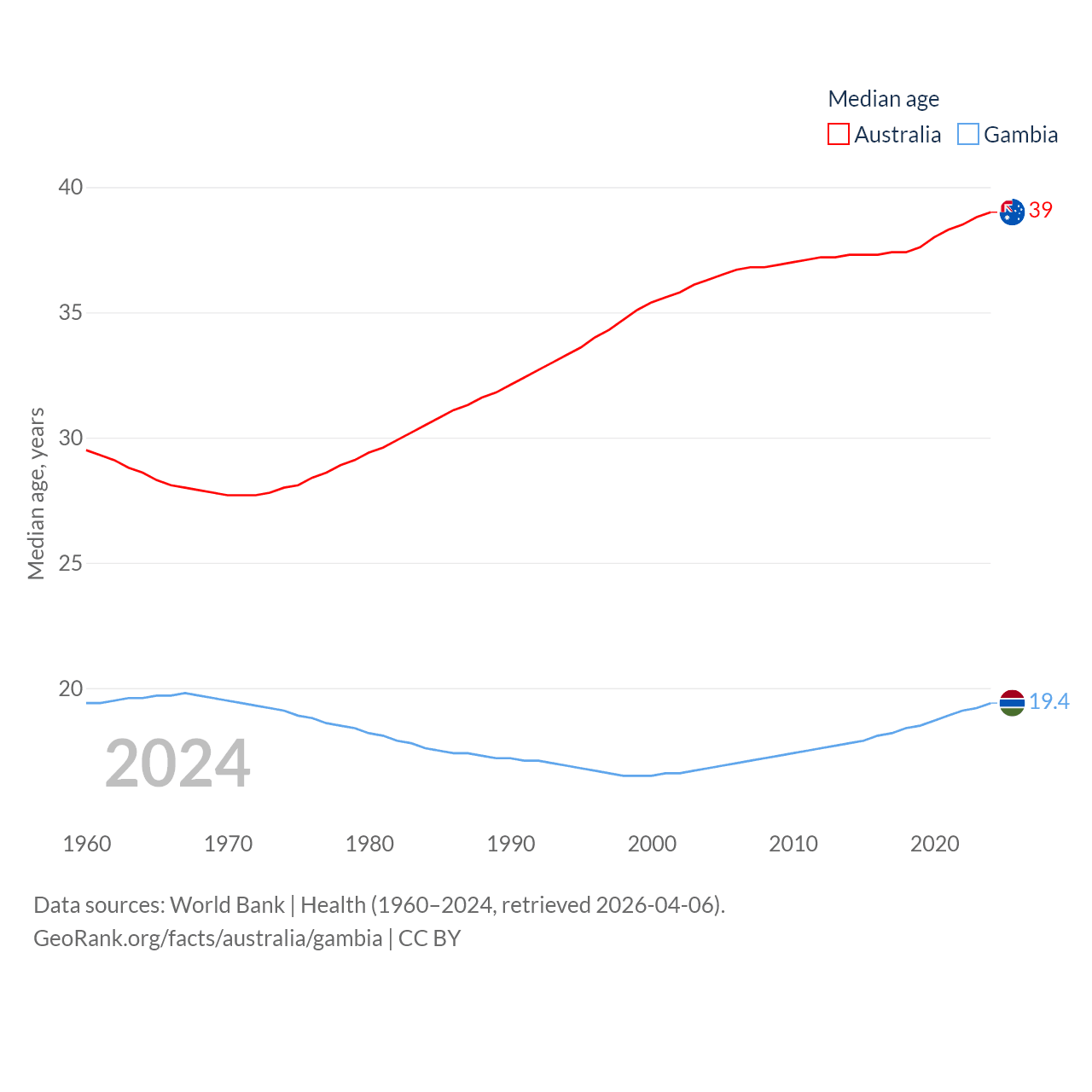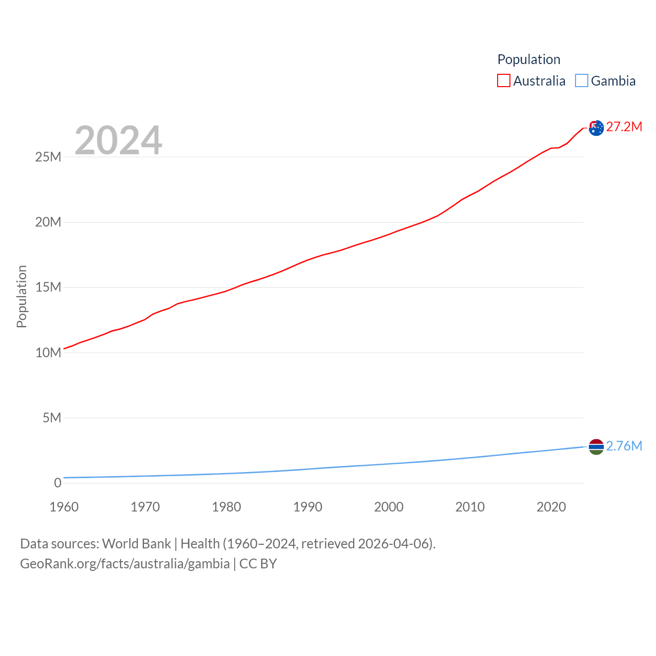 Australia has a population of 27.2M (ranked 54/197), compared with 2.76M in The Gambia (ranked 140/197). Australia's land area is 2,969,906 sq mi versus 3,907 sq mi for The Gambia (ranked 6th vs. 161st).