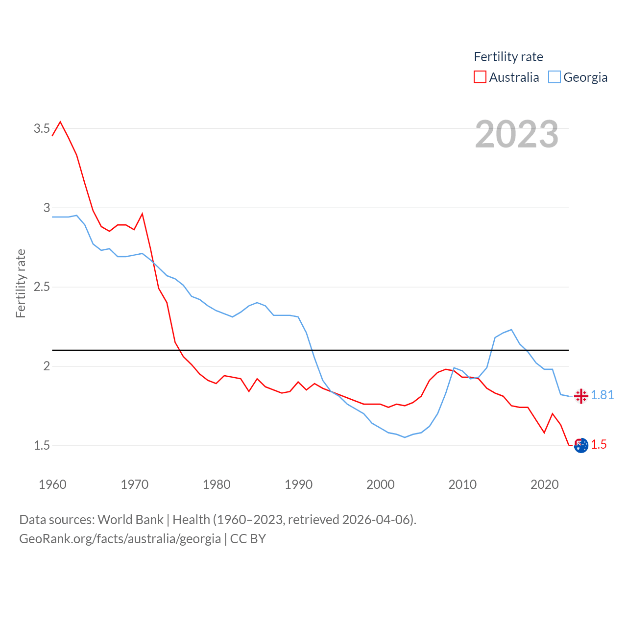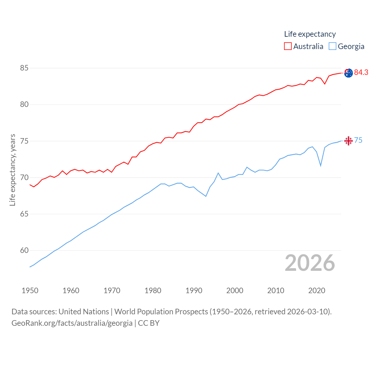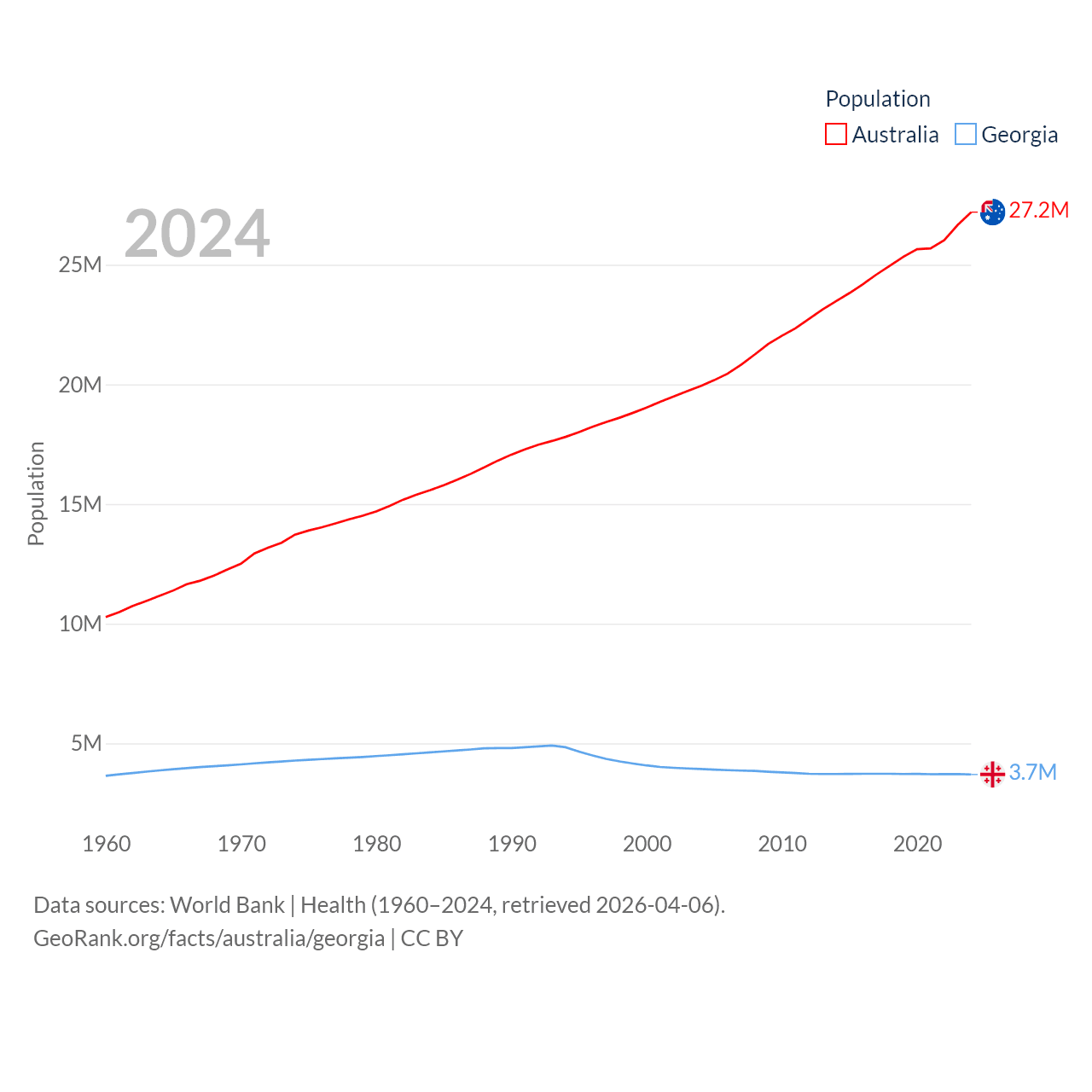 Australia has a population of 27.2M (ranked 54/197), compared with 3.7M in Georgia (ranked 130/197). Australia's land area is 2,969,906 sq mi versus 26,830 sq mi for Georgia (ranked 6th vs. 118th).