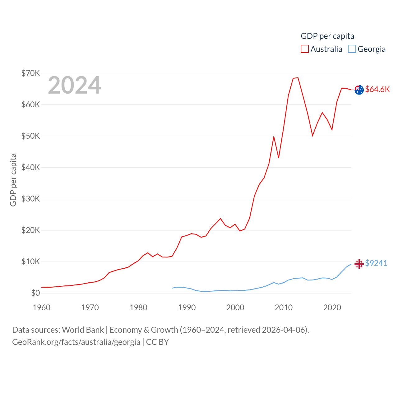 By GDP, Australia ranks 14/197 ($1.76T) and Georgia ranks 107/197 ($34.2B). By GDP per capita, Australia ranks 14/197 ($64,604), while Georgia ranks 89/197 ($9,241).