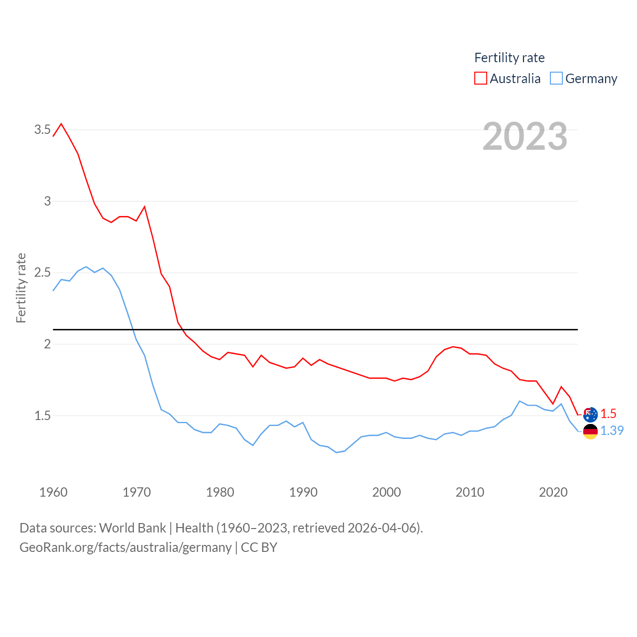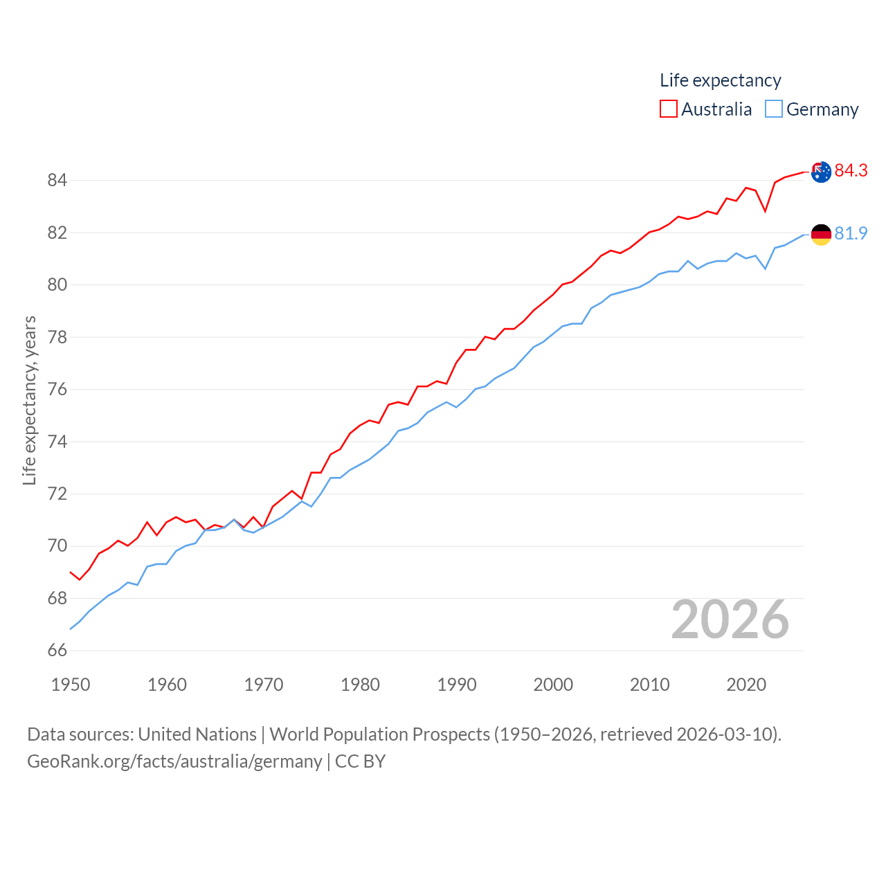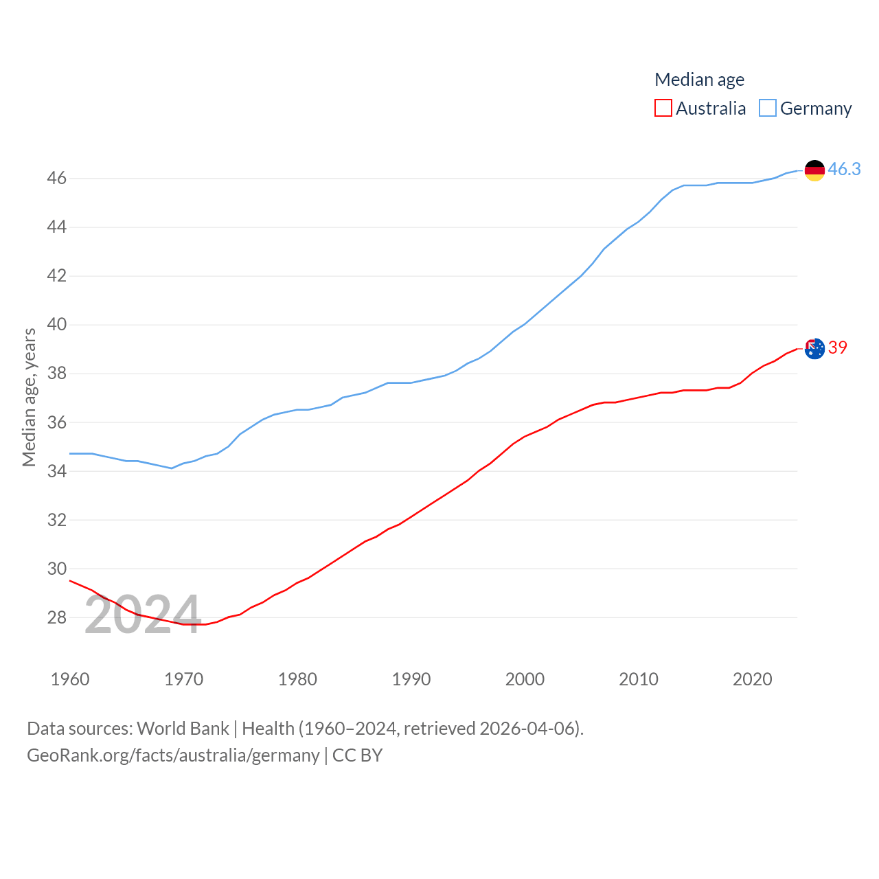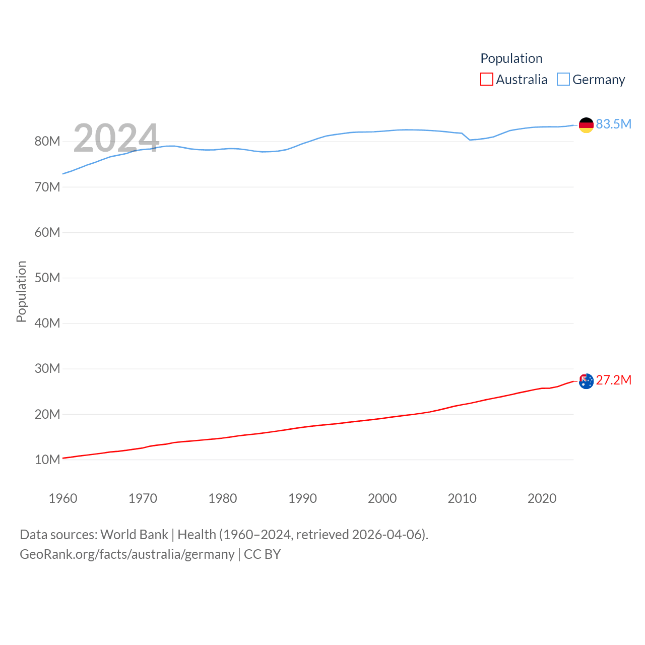 Australia has a population of 27.2M (ranked 54/197), compared with 83.5M in Germany (ranked 19/197). Australia's land area is 2,969,906 sq mi versus 134,916 sq mi for Germany (ranked 6th vs. 63rd).