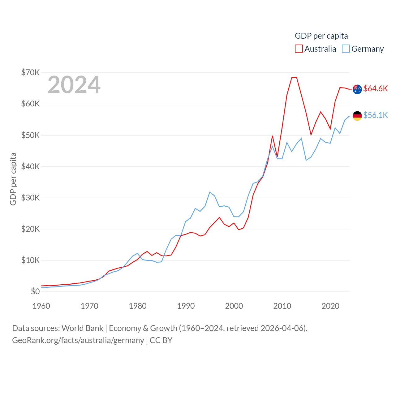 By GDP, Australia ranks 14/197 ($1.76T) and Germany ranks 3/197 ($4.69T). By GDP per capita, Australia ranks 14/197 ($64,604), while Germany ranks 19/197 ($56,104).