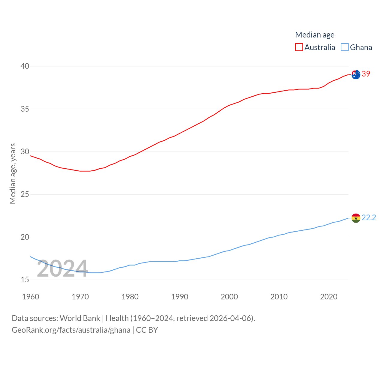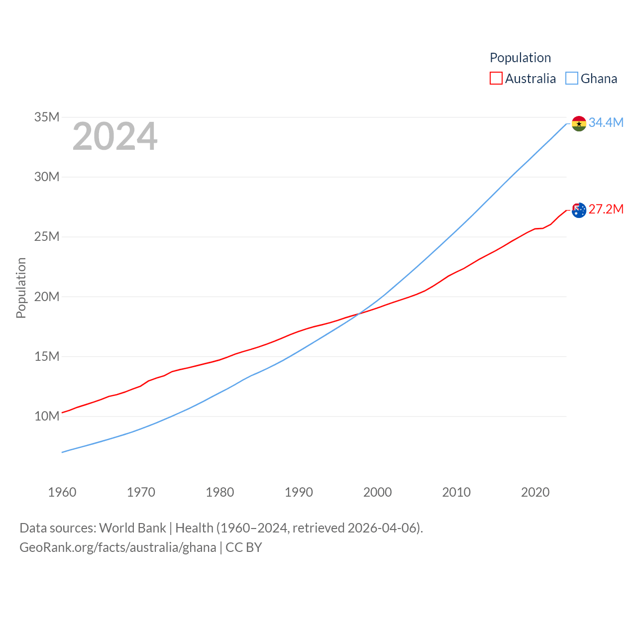 Australia has a population of 27.2M (ranked 54/197), compared with 34.4M in Ghana (ranked 47/197). Australia's land area is 2,969,906 sq mi versus 87,851 sq mi for Ghana (ranked 6th vs. 81st).
