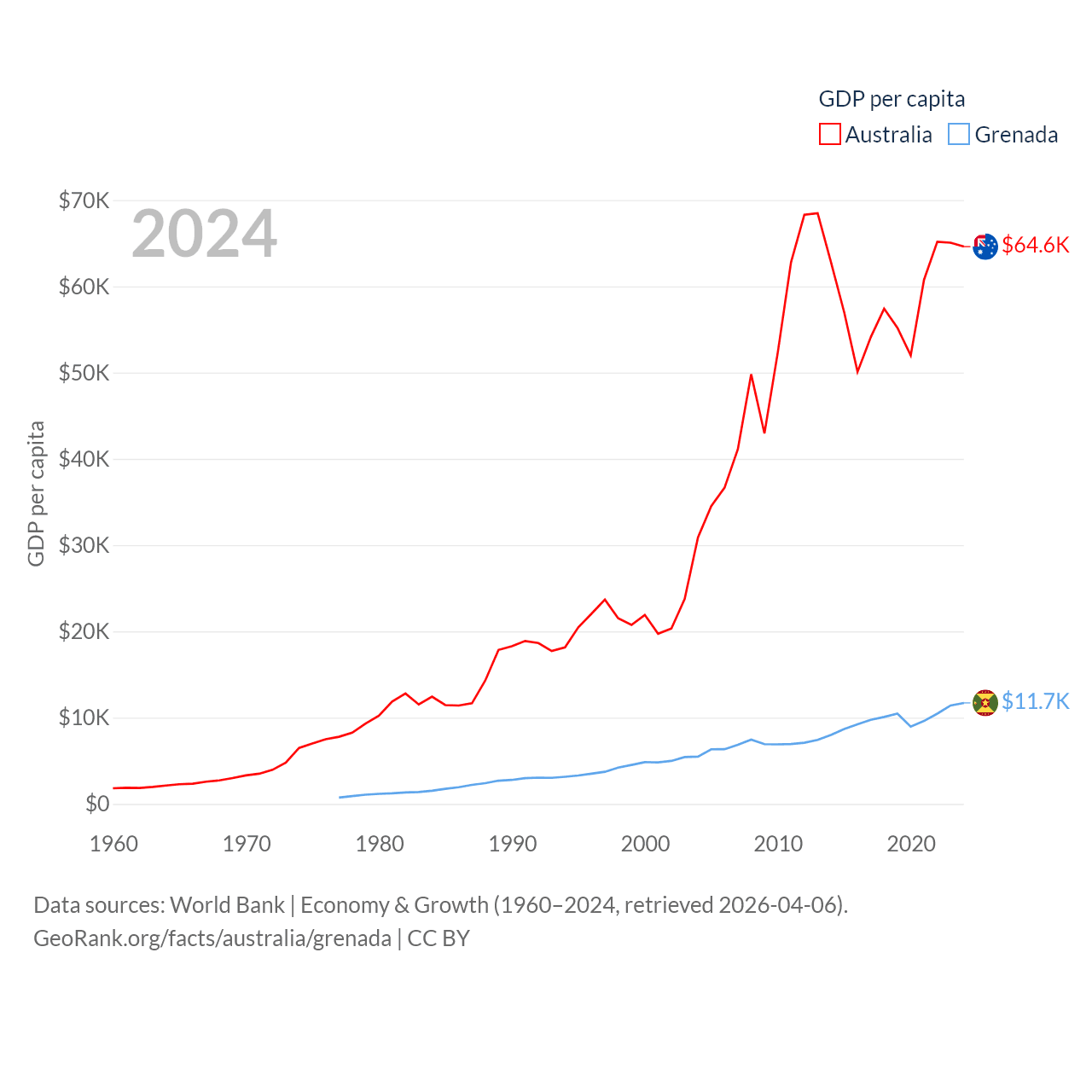 By GDP, Australia ranks 14/197 ($1.76T) and Grenada ranks 184/197 ($1.37B). By GDP per capita, Australia ranks 14/197 ($64,604), while Grenada ranks 80/197 ($11,705).