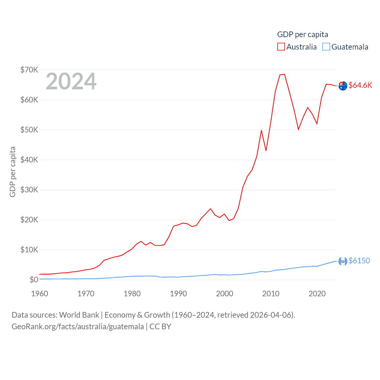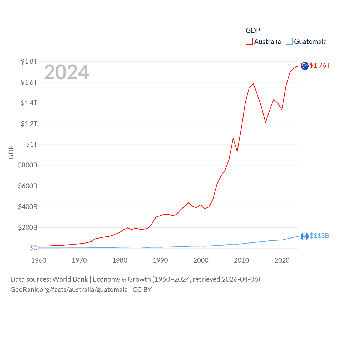 By GDP, Australia ranks 14/197 ($1.76T) and Guatemala ranks 68/197 ($113B). By GDP per capita, Australia ranks 14/197 ($64,604), while Guatemala ranks 112/197 ($6,150).