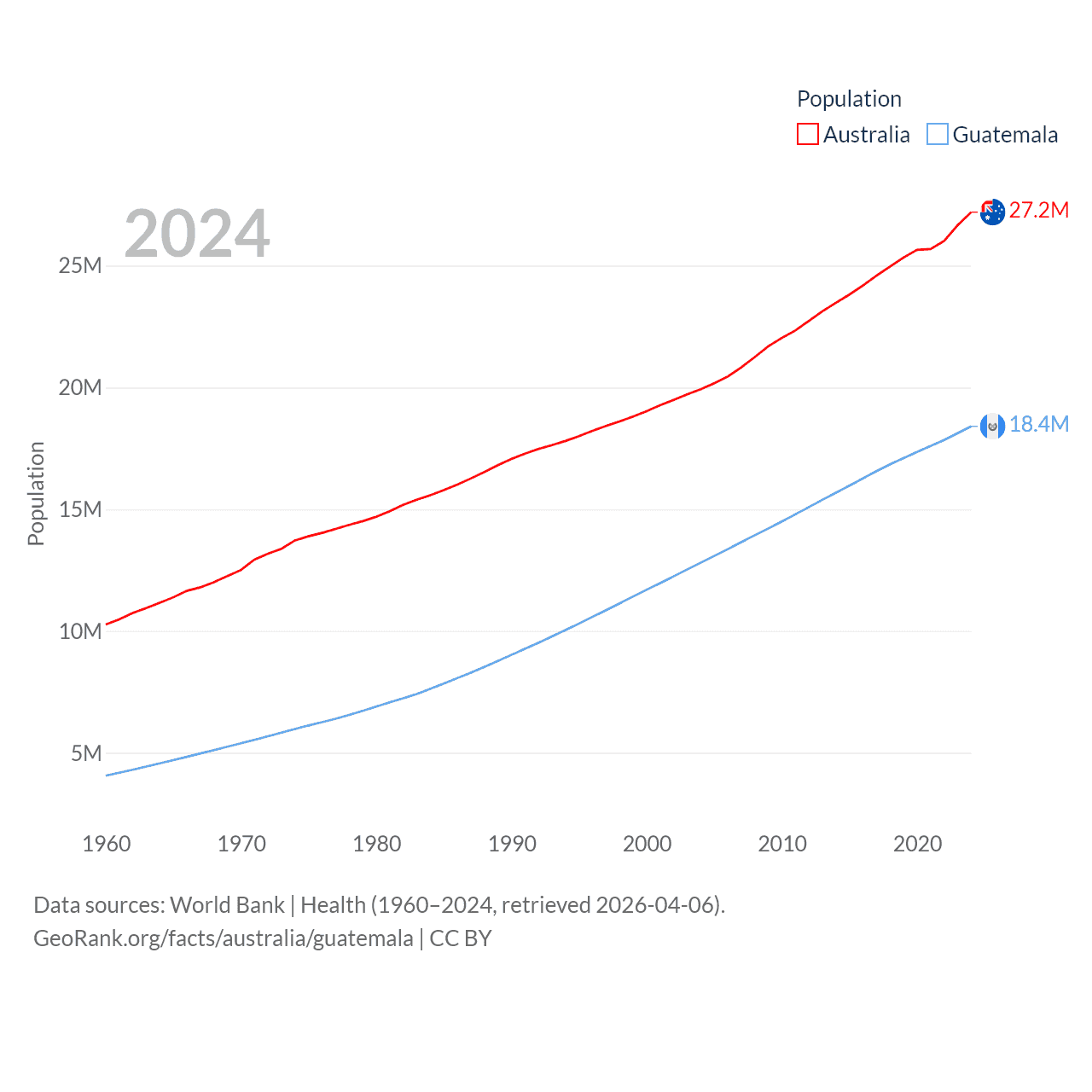 Australia has a population of 27.2M (ranked 54/197), compared with 18.4M in Guatemala (ranked 70/197). Australia's land area is 2,969,906 sq mi versus 41,375 sq mi for Guatemala (ranked 6th vs. 102nd).