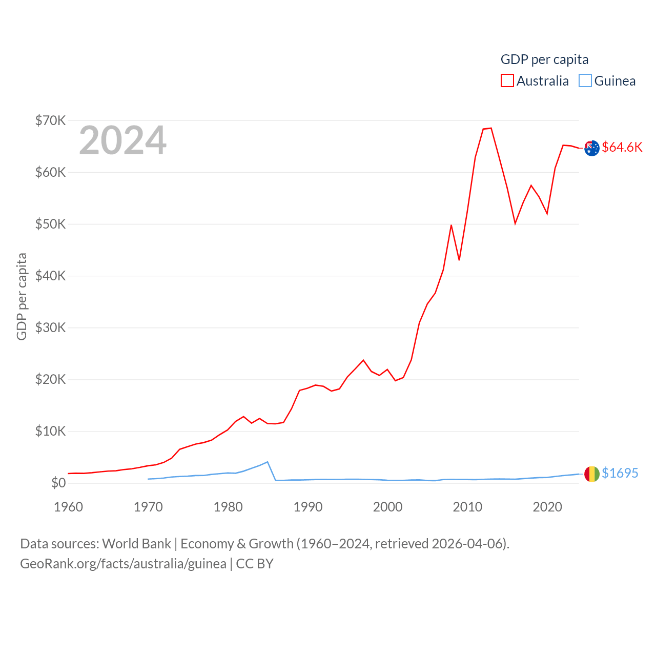 By GDP, Australia ranks 14/197 ($1.76T) and Guinea ranks 118/197 ($25B). By GDP per capita, Australia ranks 14/197 ($64,604), while Guinea ranks 160/197 ($1,695).