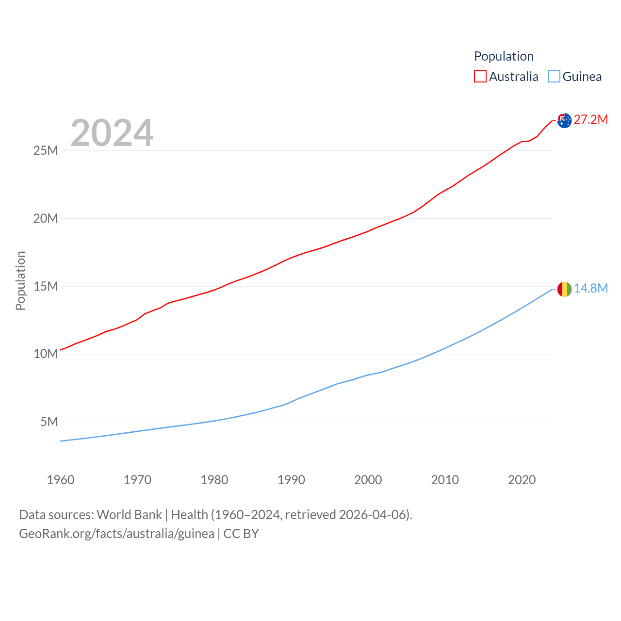 Australia has a population of 27.2M (ranked 54/197), compared with 14.8M in Guinea (ranked 75/197). Australia's land area is 2,969,906 sq mi versus 94,873 sq mi for Guinea (ranked 6th vs. 77th).