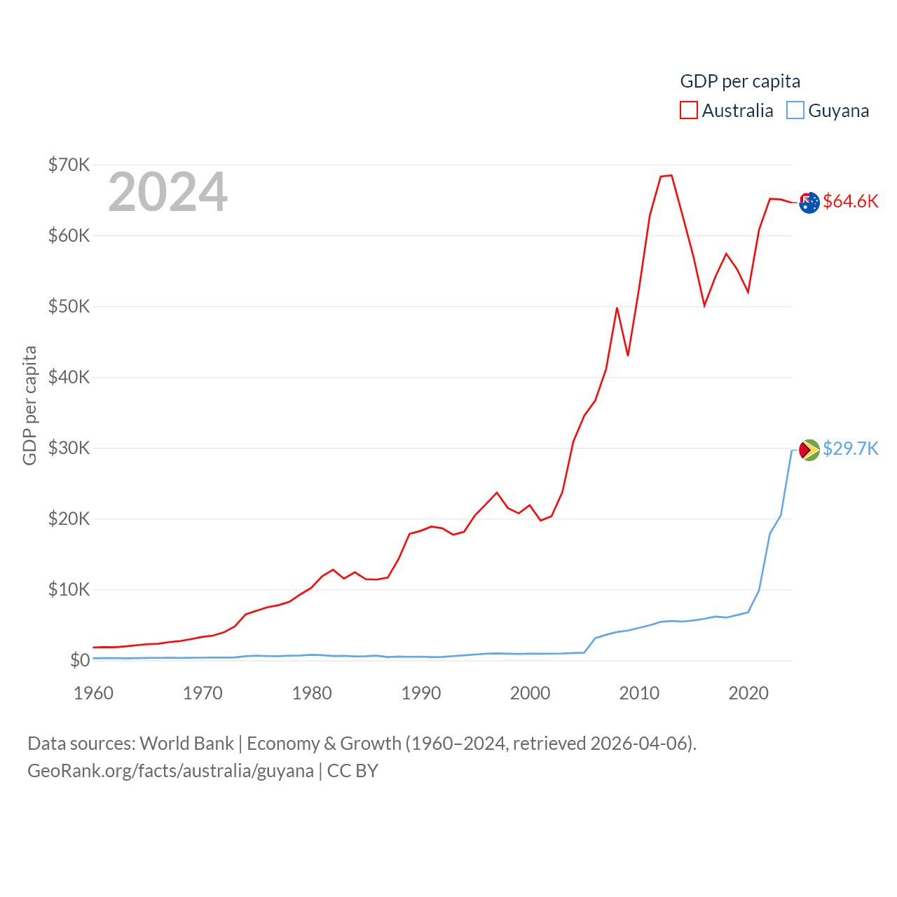 By GDP, Australia ranks 14/197 ($1.76T) and Guyana ranks 120/197 ($24.7B). By GDP per capita, Australia ranks 14/197 ($64,604), while Guyana ranks 41/197 ($29,675).