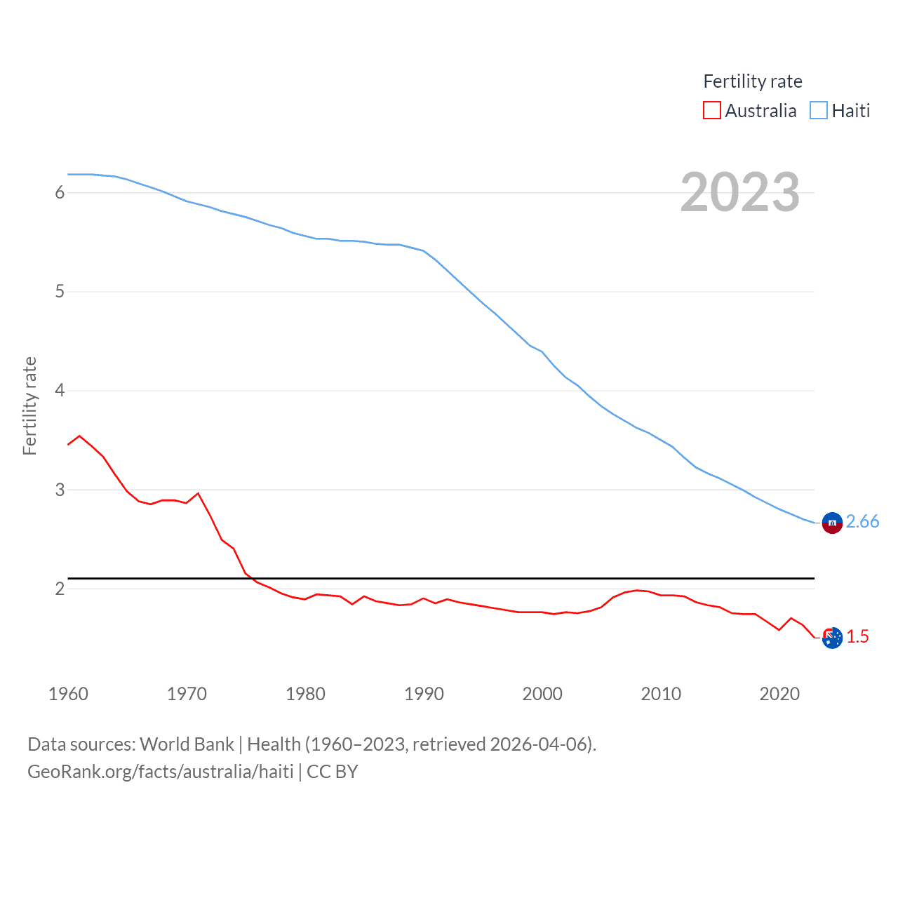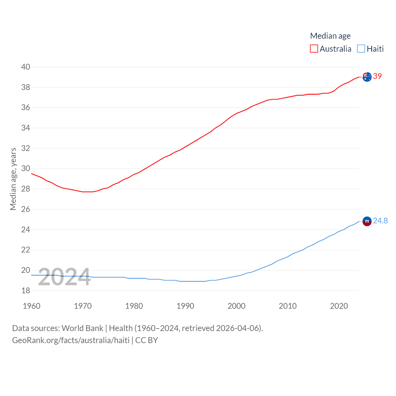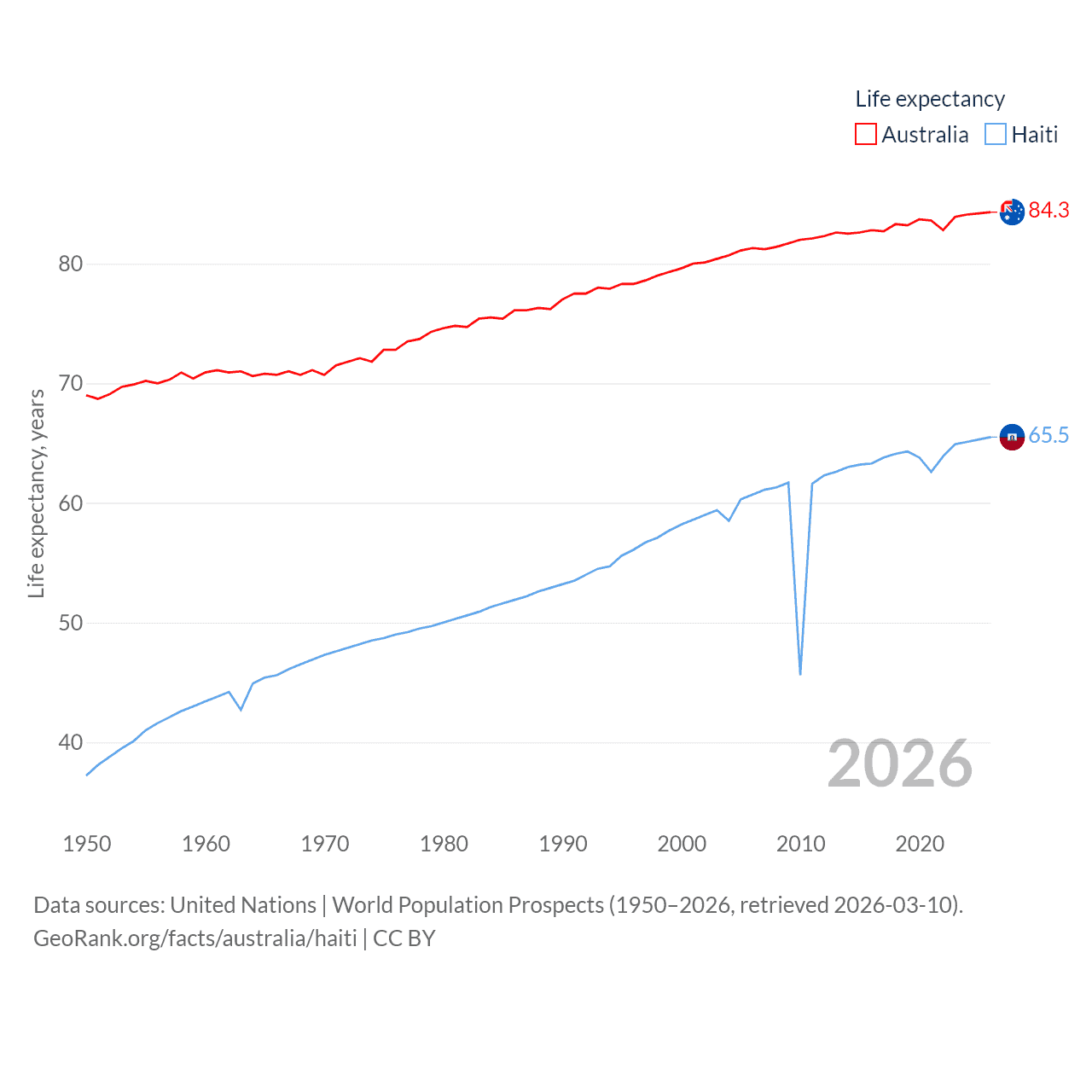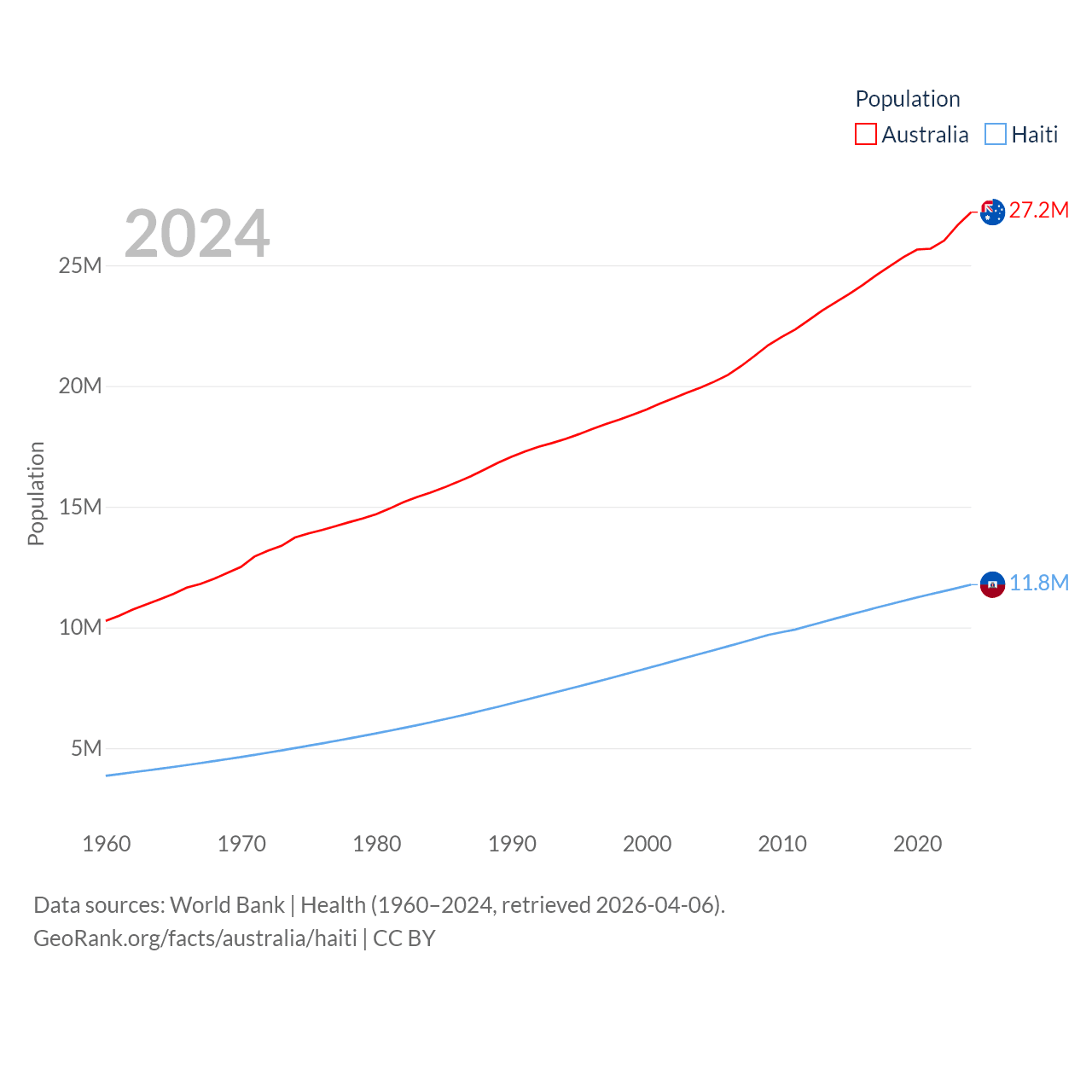 Australia has a population of 27.2M (ranked 54/197), compared with 11.8M in Haiti (ranked 83/197). Australia's land area is 2,969,906 sq mi versus 10,641 sq mi for Haiti (ranked 6th vs. 142nd).