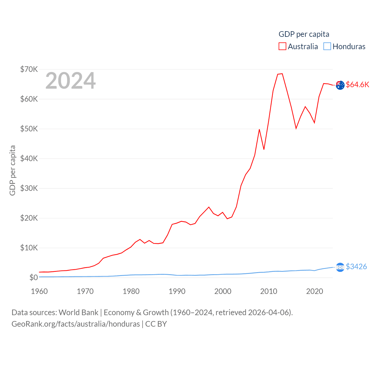 By GDP, Australia ranks 14/197 ($1.76T) and Honduras ranks 104/197 ($37.1B). By GDP per capita, Australia ranks 14/197 ($64,604), while Honduras ranks 136/197 ($3,426).