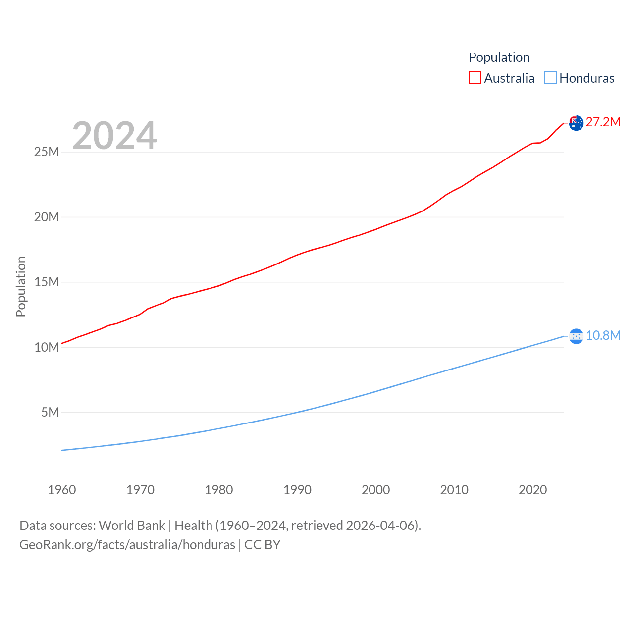 Australia has a population of 27.2M (ranked 54/197), compared with 10.8M in Honduras (ranked 89/197). Australia's land area is 2,969,906 sq mi versus 43,201 sq mi for Honduras (ranked 6th vs. 100th).