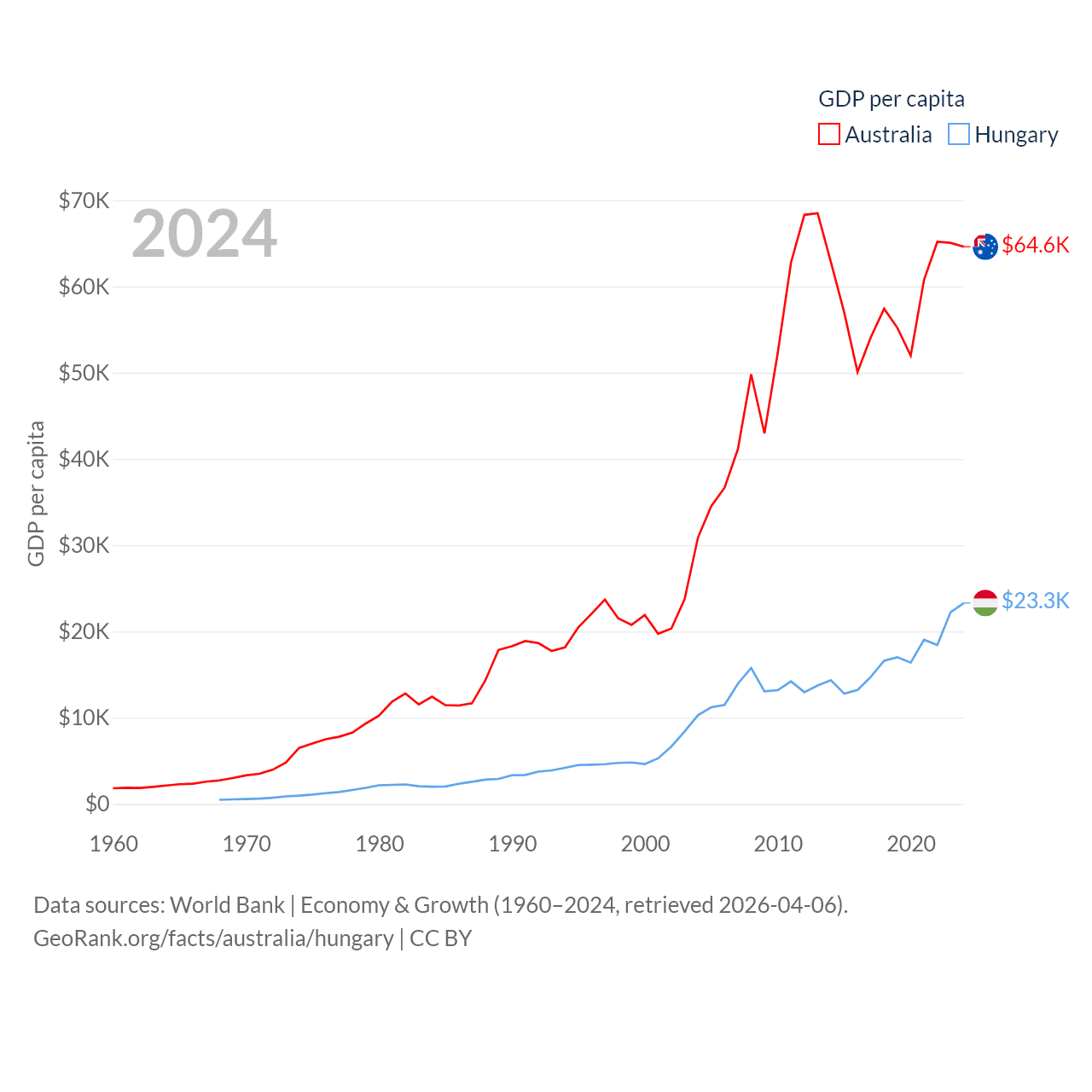 By GDP, Australia ranks 14/197 ($1.76T) and Hungary ranks 55/197 ($223B). By GDP per capita, Australia ranks 14/197 ($64,604), while Hungary ranks 55/197 ($23,292).