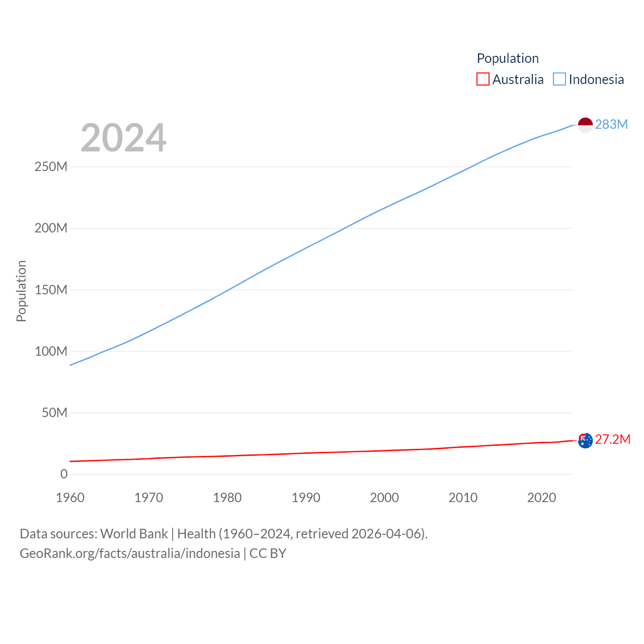 Australia has a population of 27.2M (ranked 54/197), compared with 283M in Indonesia (ranked 4/197). Australia's land area is 2,969,906 sq mi versus 730,720 sq mi for Indonesia (ranked 6th vs. 14th).