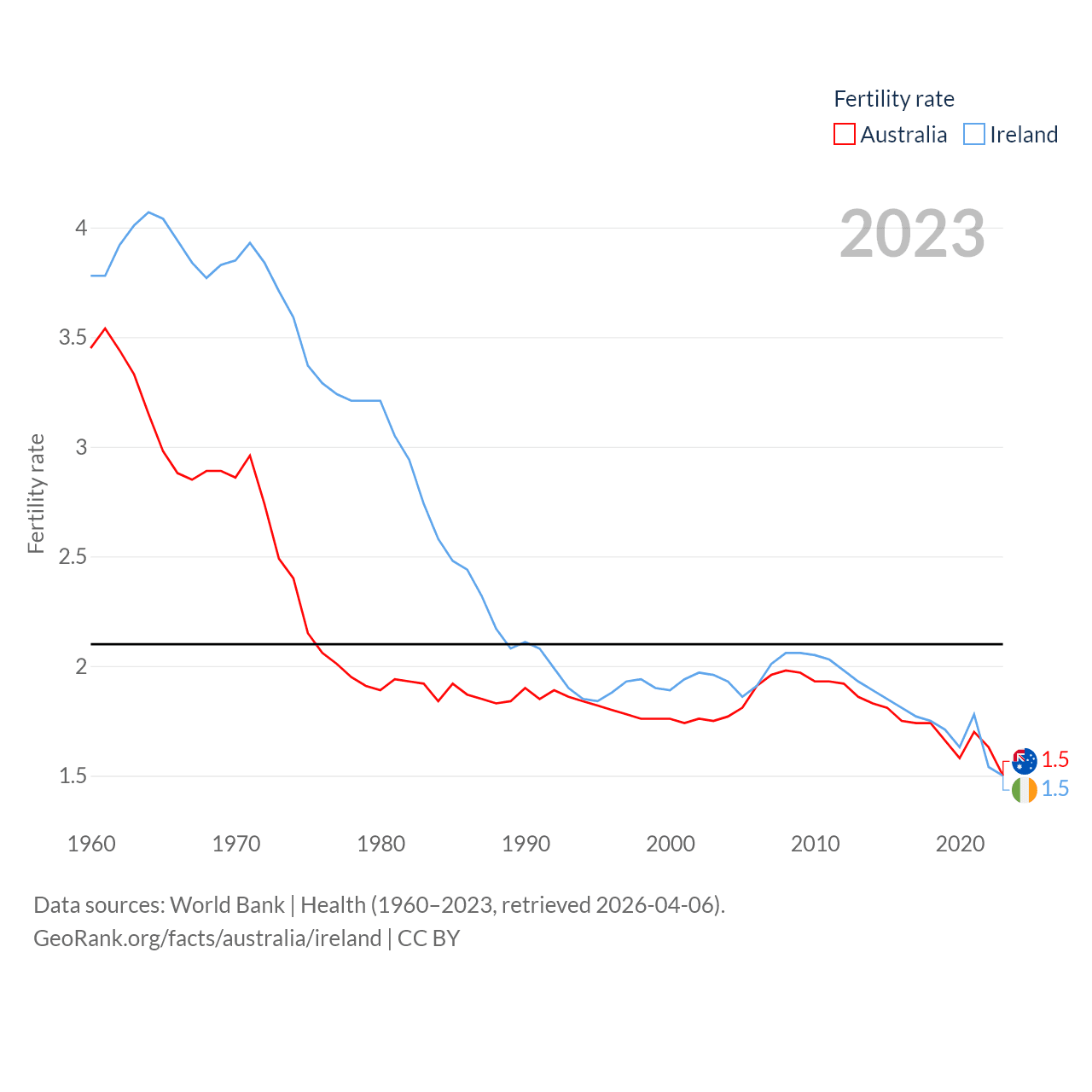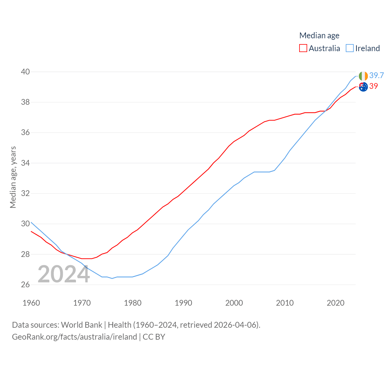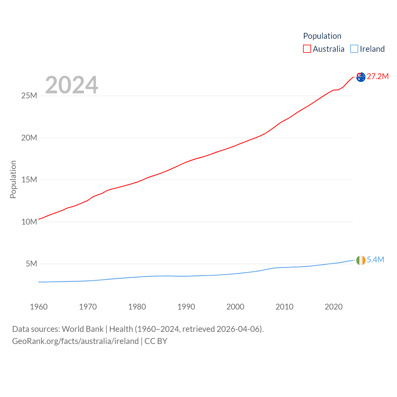 Australia has a population of 27.2M (ranked 54/197), compared with 5.4M in Ireland (ranked 120/197). Australia's land area is 2,969,906 sq mi versus 26,599 sq mi for Ireland (ranked 6th vs. 119th).