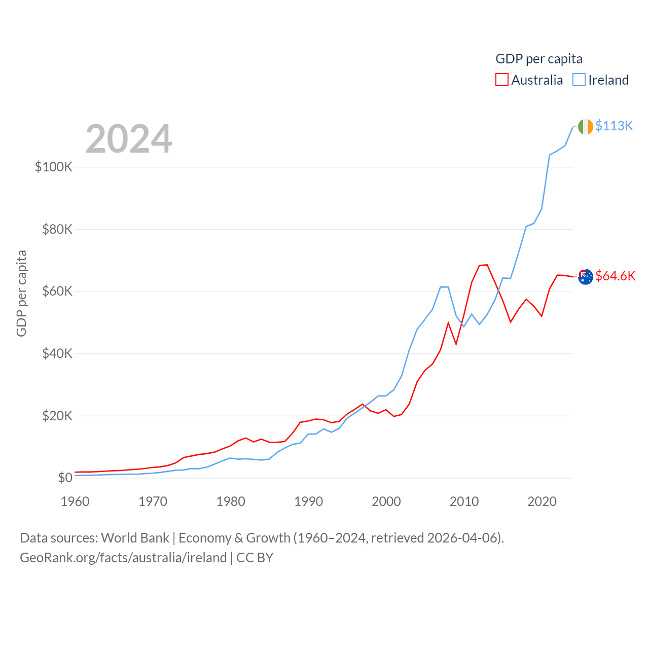 By GDP, Australia ranks 14/197 ($1.76T) and Ireland ranks 25/197 ($609B). By GDP per capita, Australia ranks 14/197 ($64,604), while Ireland ranks 4/197 ($112,895).
