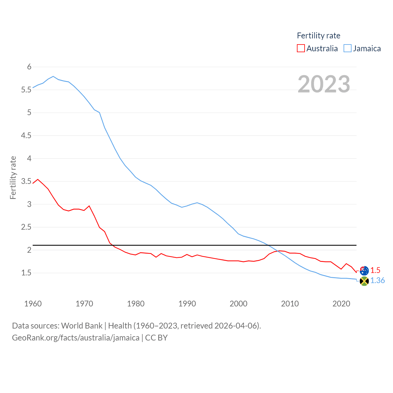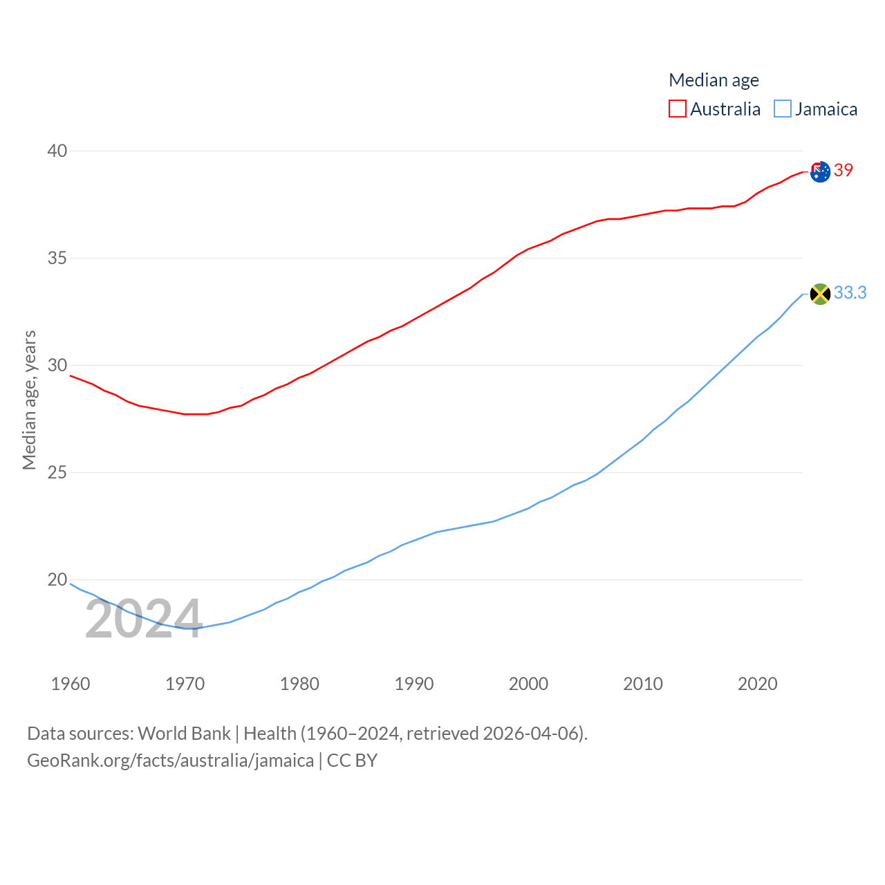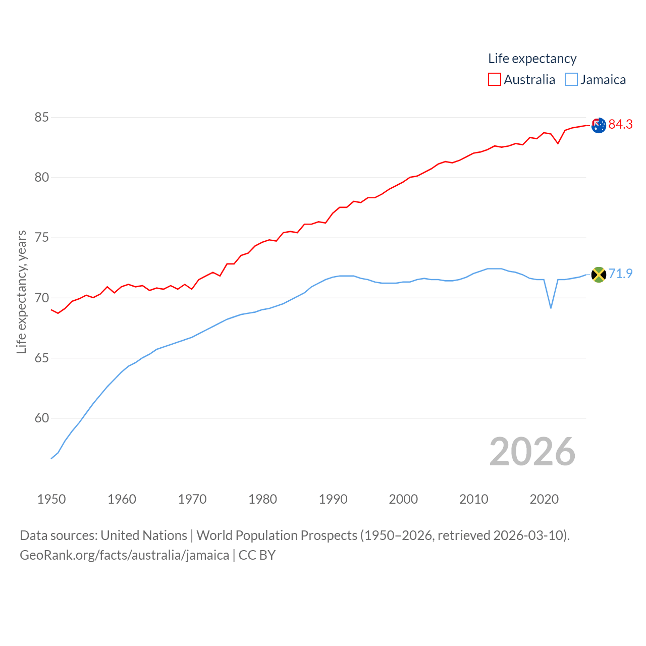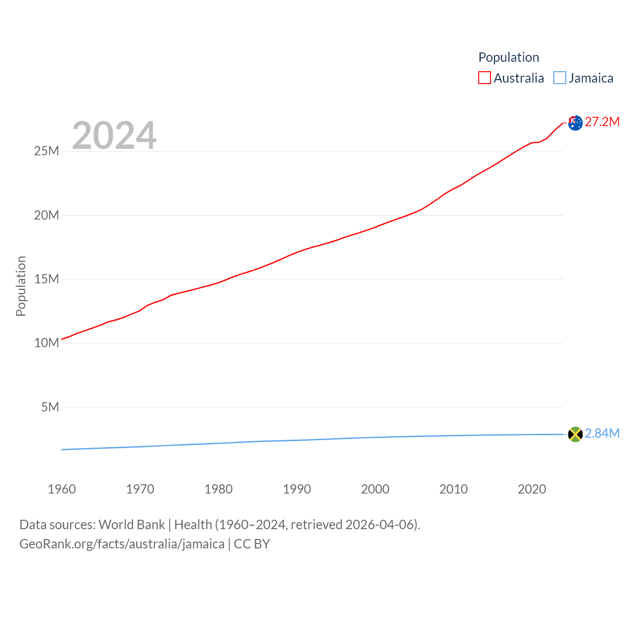 Australia has a population of 27.2M (ranked 54/197), compared with 2.84M in Jamaica (ranked 139/197). Australia's land area is 2,969,906 sq mi versus 4,181 sq mi for Jamaica (ranked 6th vs. 159th).