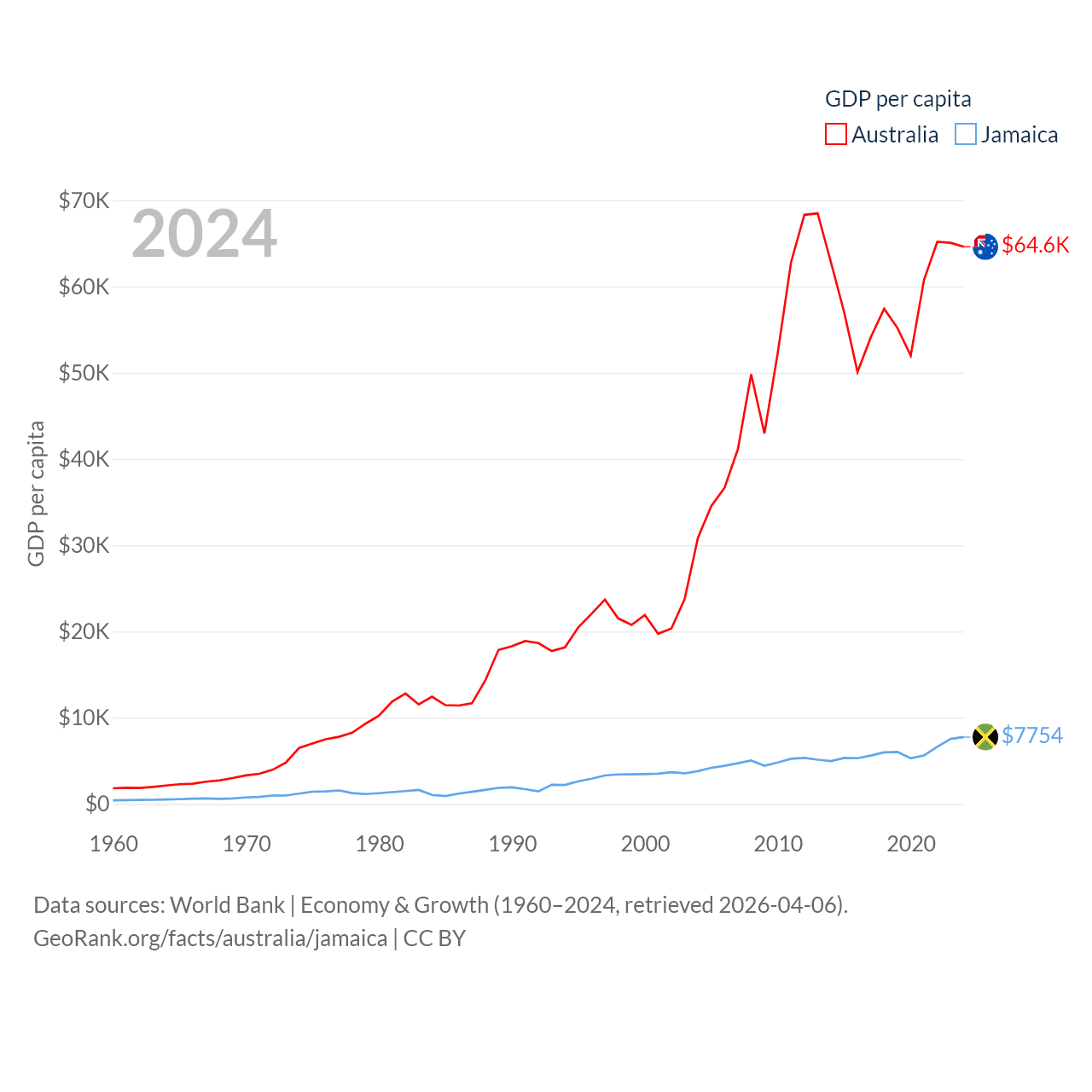 By GDP, Australia ranks 14/197 ($1.76T) and Jamaica ranks 124/197 ($22B). By GDP per capita, Australia ranks 14/197 ($64,604), while Jamaica ranks 95/197 ($7,754).