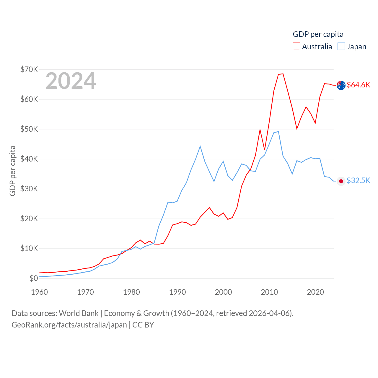 By GDP, Australia ranks 14/197 ($1.76T) and Japan ranks 4/197 ($4.03T). By GDP per capita, Australia ranks 14/197 ($64,604), while Japan ranks 38/197 ($32,487).